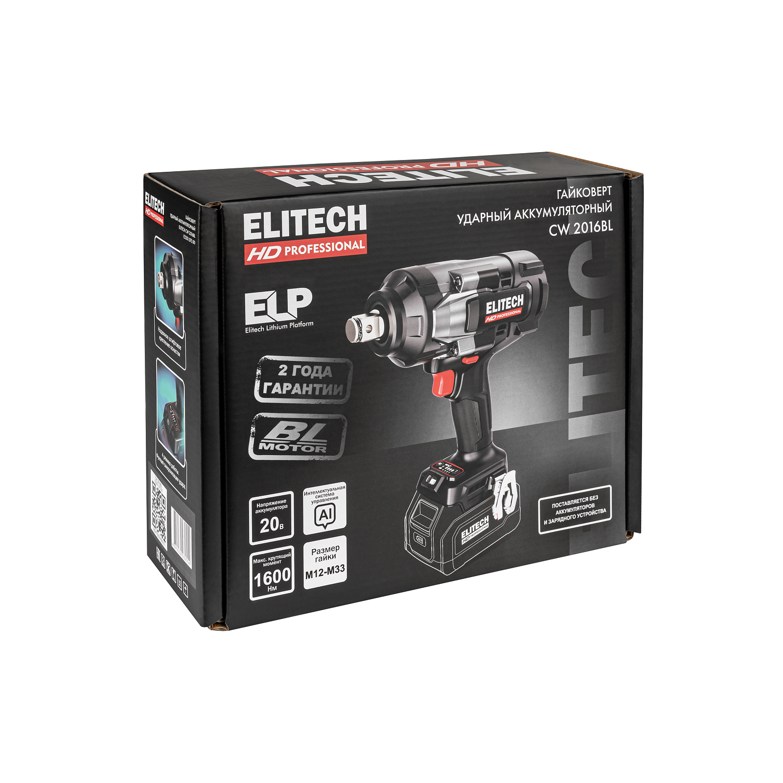 Гайковёрт ударный аккумуляторный ELITECH HD CW 2016BL с безщеточным электродвигателем напряжением 20 В, предназначен для работы с резьбовым крепежом (болты и гайки), закручивания и откручивания крепежных элементов при сборке или разборке металлических конструкций, снятии и установке колес автомобиля и т.д. Гайковёрт обеспечивает высокий крутящий момент при откручивании - до 2100 Нм, при минимальном усилии пользователя. Поставляется без аккумулятора и зарядного устройства. Совместимый аккумулятор : 205869 ELITECH HD RCB 2020S (E0911.089.00) 2 Ач 205871 ELITECH HD RCB 2040S (E0911.091.00) 4 Ач 205872 ELITECH HD RCB 2050S (E0911.092.00) 5 Ач Совместимое зарядное устройство: 205798 ELITECH HD CS 1220 (E0911.019.00) 205799 ELITECH HD CS 1222 (E0911.020.00) двойное