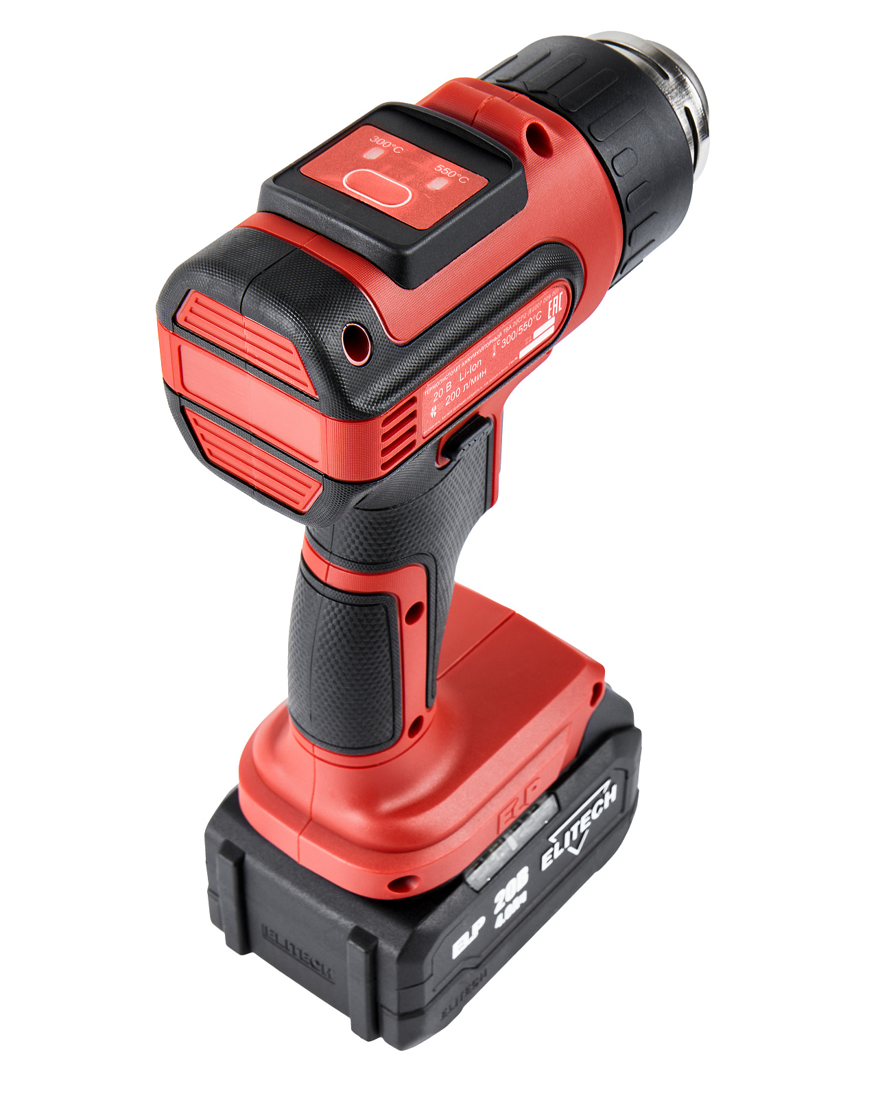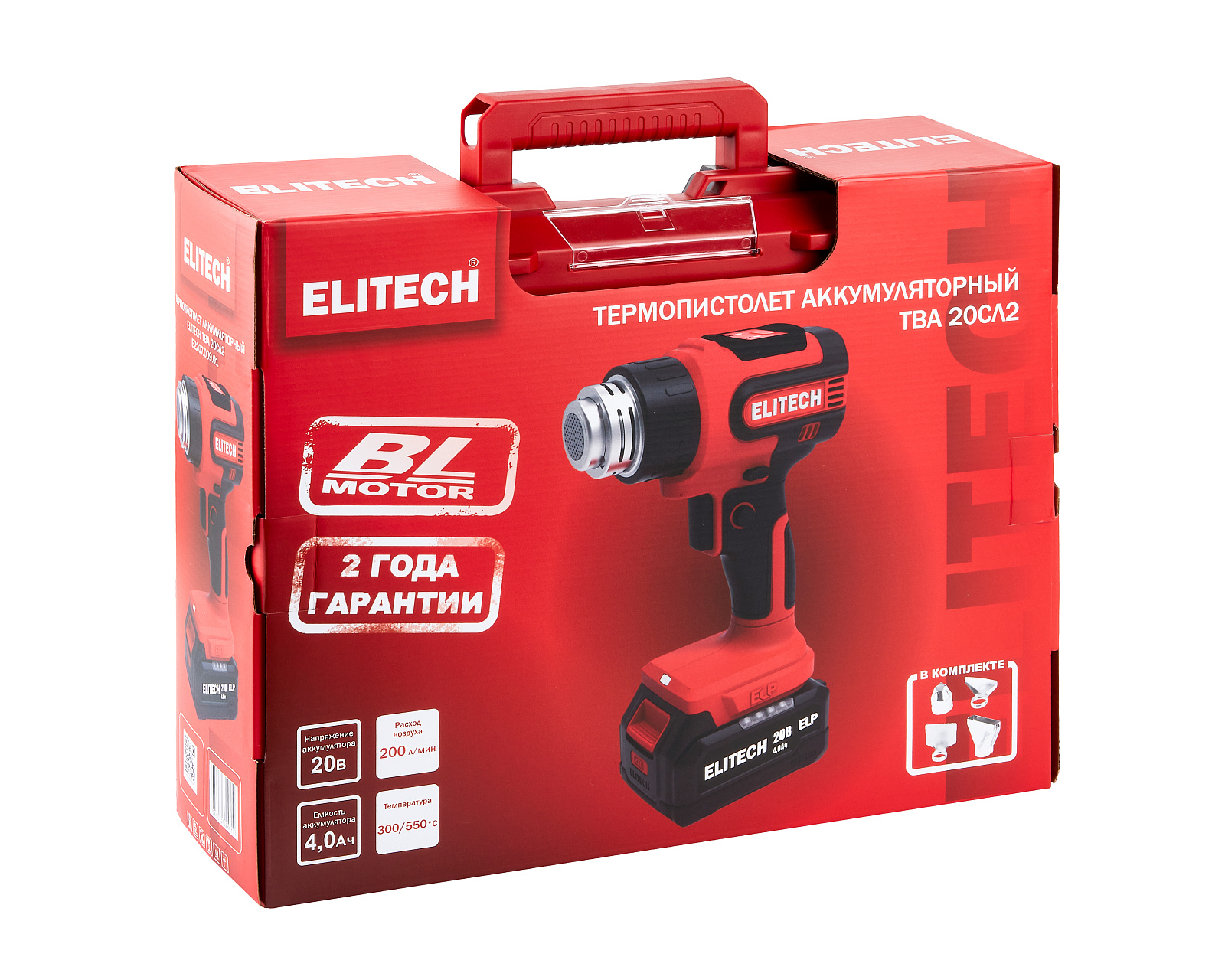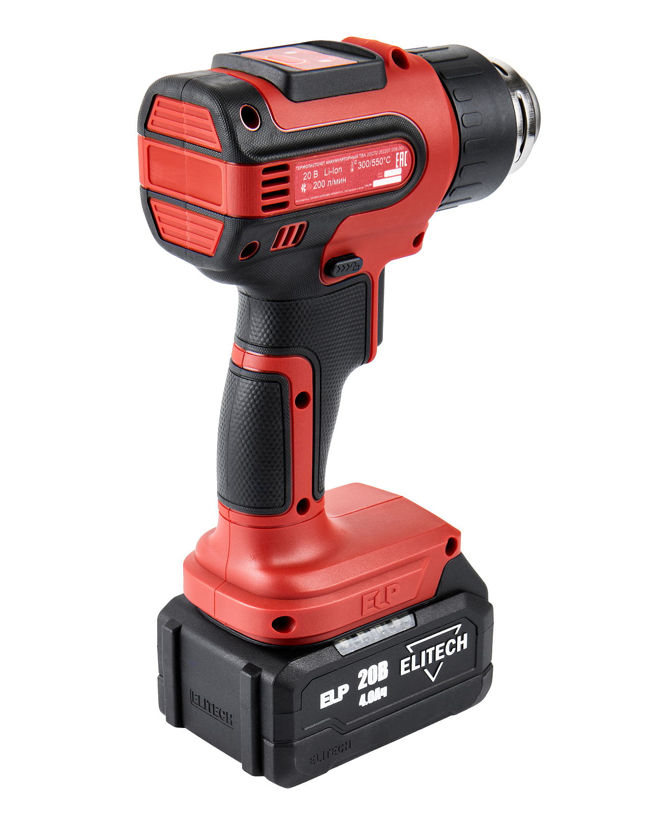 Пистолет г/возд ак, 20В, 1х4.0Ач, ELP, 200л/м, 300/550грС, чем, 520г(или 0.52кг), 4 насадки