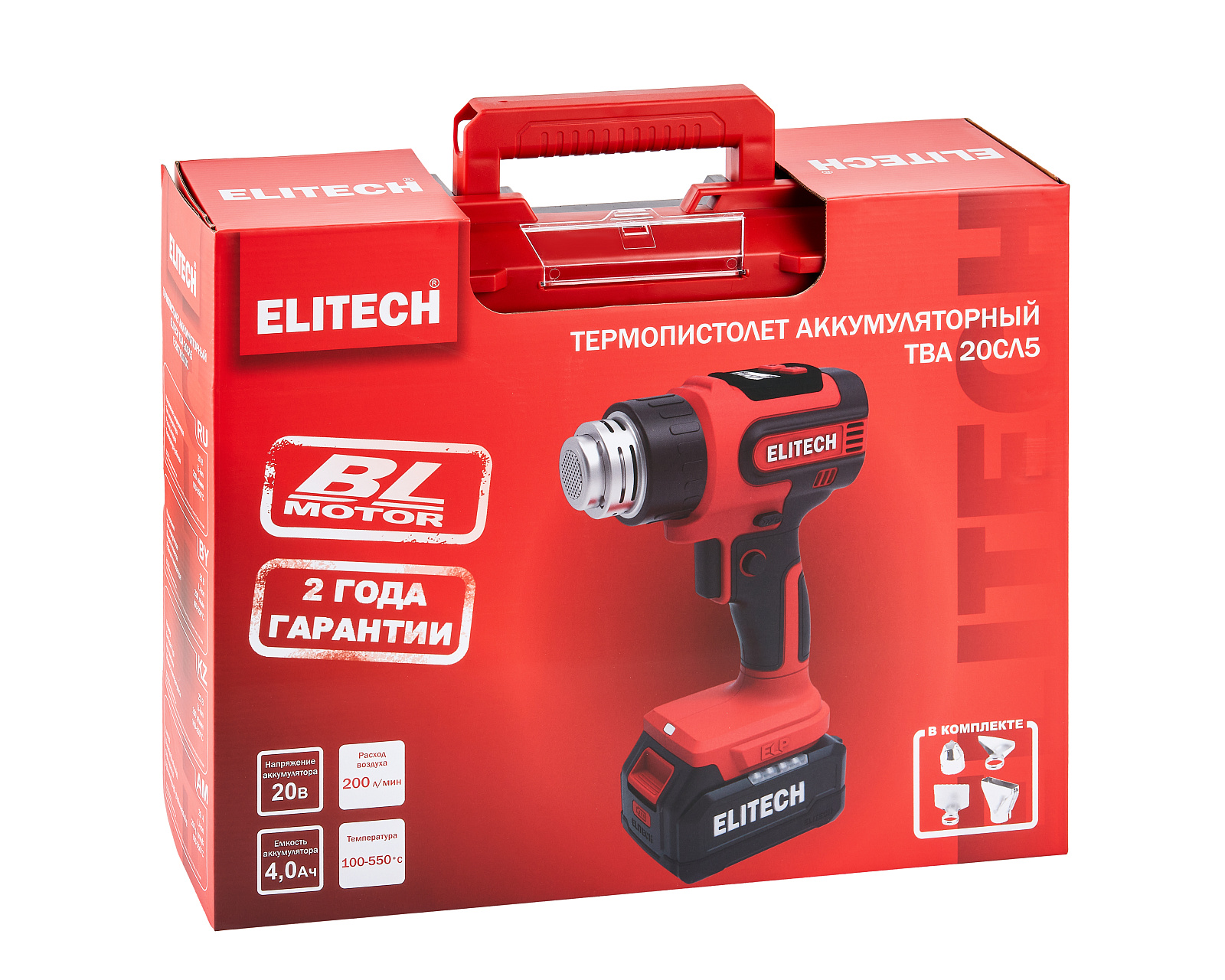 ELITECH Пистолет горячего воздуха (технический фен) ELITECH ТВА 20СЛ5. Используется при следующих видах работ: снятие лакокрасочных покрытий с деревянных поверхностей, пайка, сварка и формовка пластика, осаживание термоусадочных материалов, ускорение процессов склеивания, пайка мягким припоем и лужение, сушка и размораживание, сварка и резка листовых и рулонных материалов (линолеума и подобных).
