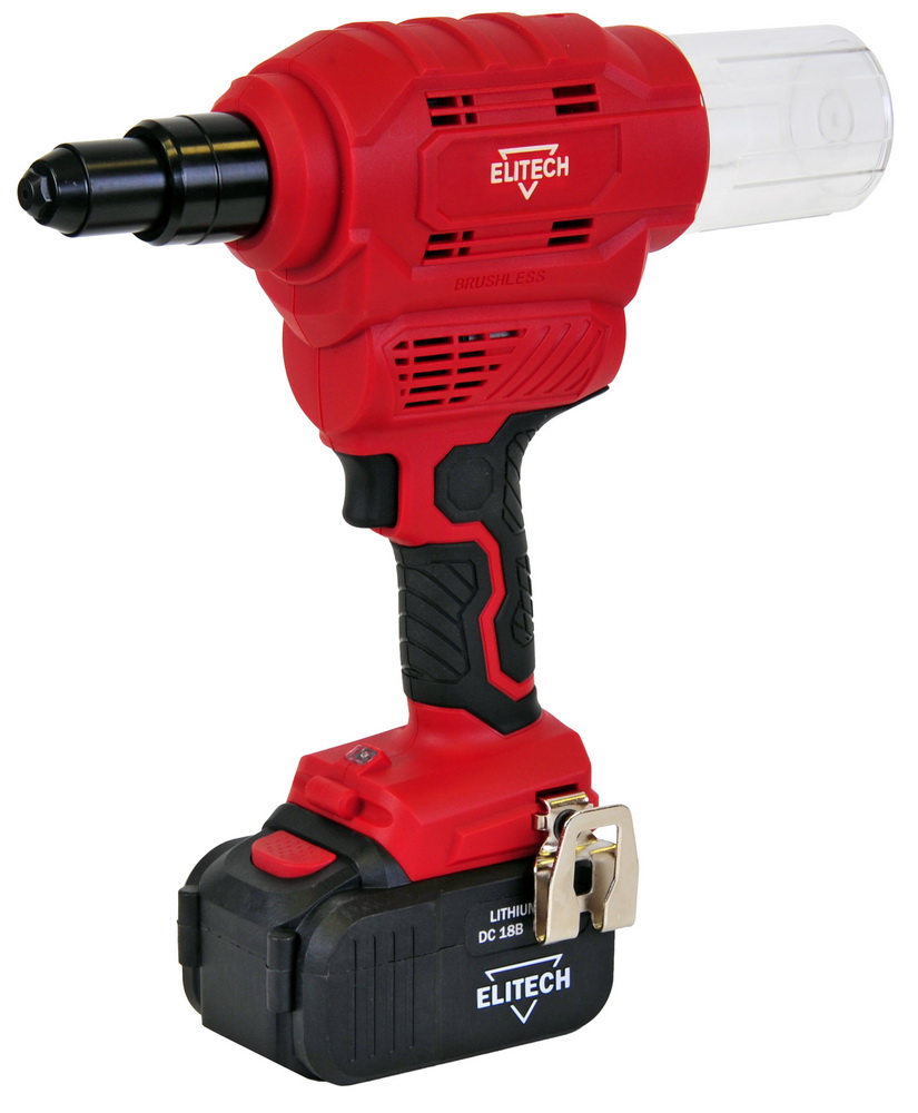 Пистолет заклепечный аккумуляторный ELITECH ПЗА 18БЛ (E2208.004.01). Предназначен для установки стандартных вытяжных заклепок из любого материала, диаметром от 2,4 -до 6,4 мм.