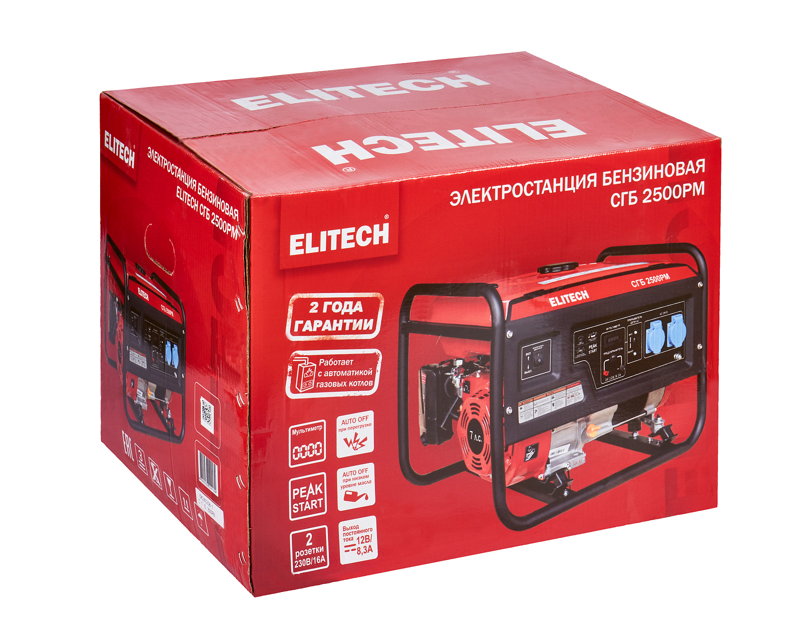 Электростанция ELITECH СГБ 2500РМ предназначена для работы в качестве автономного источника электроэнергии переменного однофазного тока напряжением 230В, частотой 50Гц. Электростанция может эксплуатироваться в следующих условиях: - рабочая температура окружающего воздуха – от -15°С до +40°С; - влажность – до 80% при температуре +25°С; - высота над уровнем моря до 1000 м.