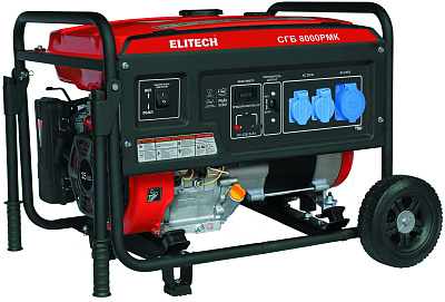 Электростанция СГБ 8000 РМК с четырехтактным бензиновым двигателем. Однофазная. Номинальная мощность 6 кВт. Две розетки 220В/16А. Одна розетка 220В/32А. Электростартер.