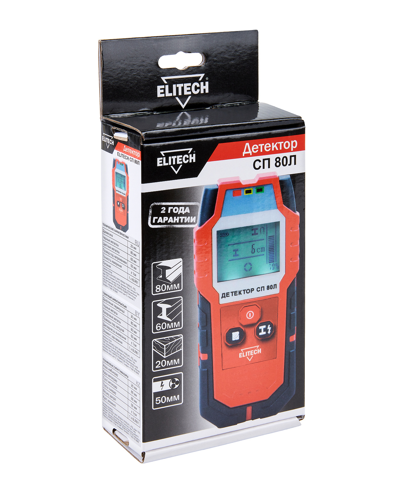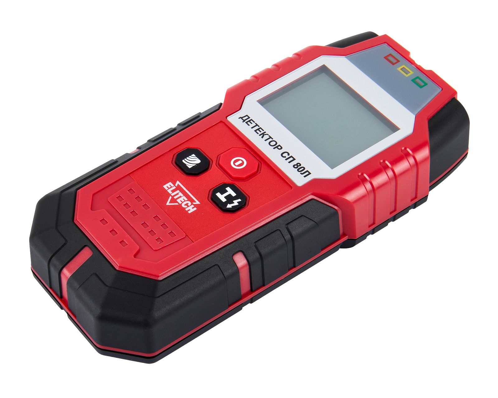 ELITECH Детектор ELITECH СП 80Л. Предназначен для обнаружения в стенах, полах и потолках цветных и черных металлов, деревянных перекрытий, а также проводов под напряжением посредством электрического сигнала.