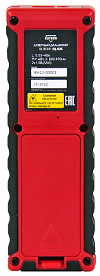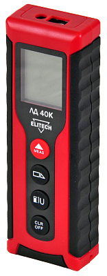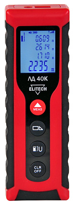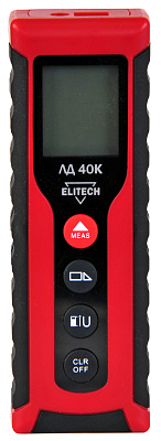 Лазерный дальномер ELITECH ЛД 40К предназначен для быстрого измерения расстояний на дальности до 40 метров. Он точнее обычной рулетки при измерении расстояния более 8 метров. Дальномер имеет возможность производить косвенные вычисления (измерять высоту объекта) по теореме Пифагора, а также замеры площади и объема. В качестве начала измерения используется 2 точки отсчета – от передней или задней кромки. Дисплей прибора имеет подсветку, что повышает удобство работы с прибором в условиях недостаточной освещенности. Прибор позволяет сохранить в памяти 20 значения измерений. Прибор оснащен креплением на штатив с резьбой 1/4'.