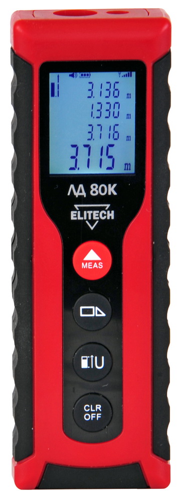 Лазерный дальномер ELITECH ЛД 80К предназначен для быстрого измерения расстояний на дальности до 80 метров. Он точнее обычной рулетки при измерении расстояния более 8 метров. Дальномер имеет возможность производить косвенные вычисления (измерять высоту объекта) по теореме Пифагора, а также замеры площади и объема. В качестве начала измерения используется 2 точки отсчета – от передней или задней кромки. Дисплей прибора имеет подсветку, что повышает удобство работы с прибором в условиях недостаточной освещенности. Прибор позволяет сохранить в памяти 20 значения измерений. Прибор оснащен креплением на штатив с резьбой 1/4'.