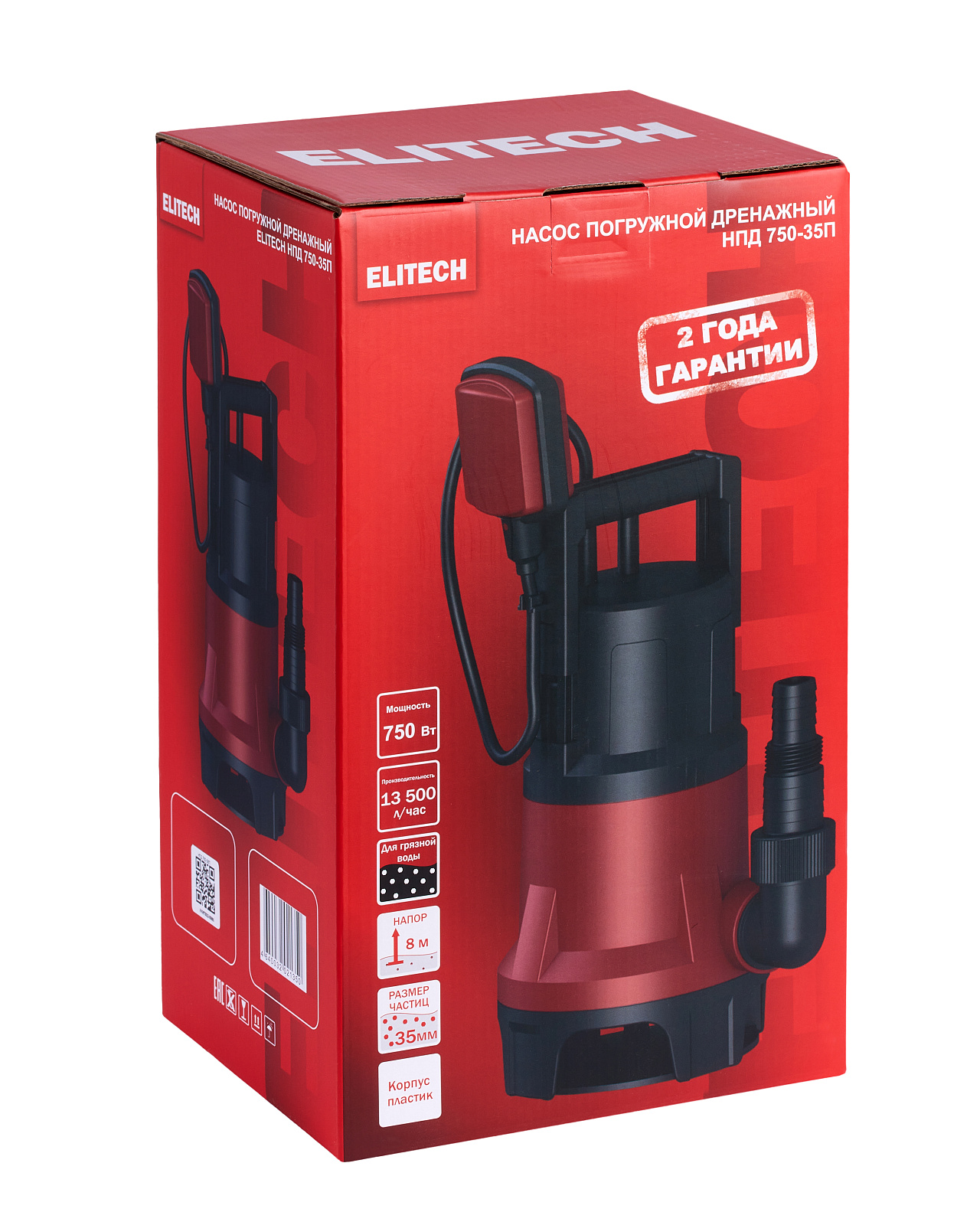 Погружной дренажный насос «ELITECH» мощностью 750 Вт и производительностью 13 500 л/час предназначен для перекачивания загрязненной воды с диаметром твердых частиц не более 35 мм из колодцев, открытых водоемов, затапливаемых подвалов и других источников. Максимальная температура воды не должна превышать 35°С. Насос не предназначен для перекачивания едких, легковоспламеняемых и взрывчатых веществ (нефть, бензин, растворители), а также масел и жиров. Насос оснащен поплавковым выключателем, который позволяет ему работать в автоматическом режиме в зависимости от изменения уровня воды.