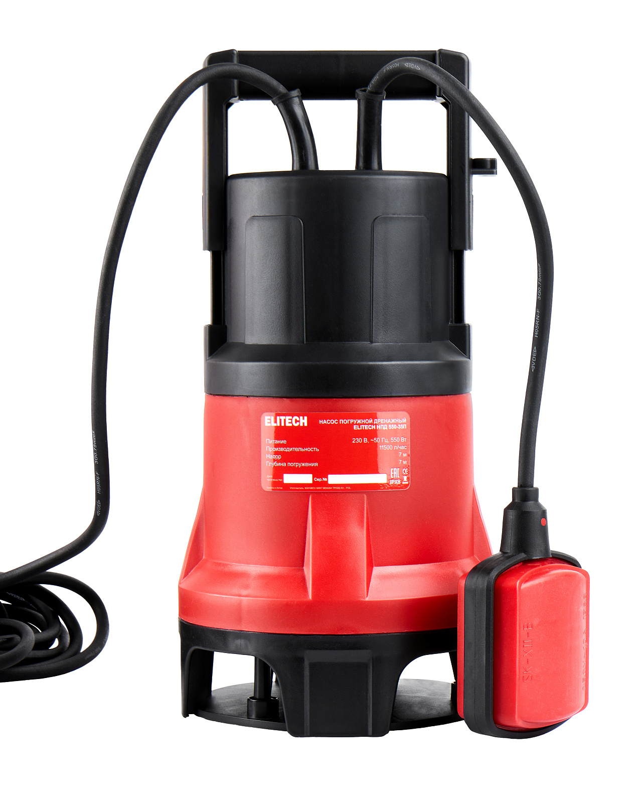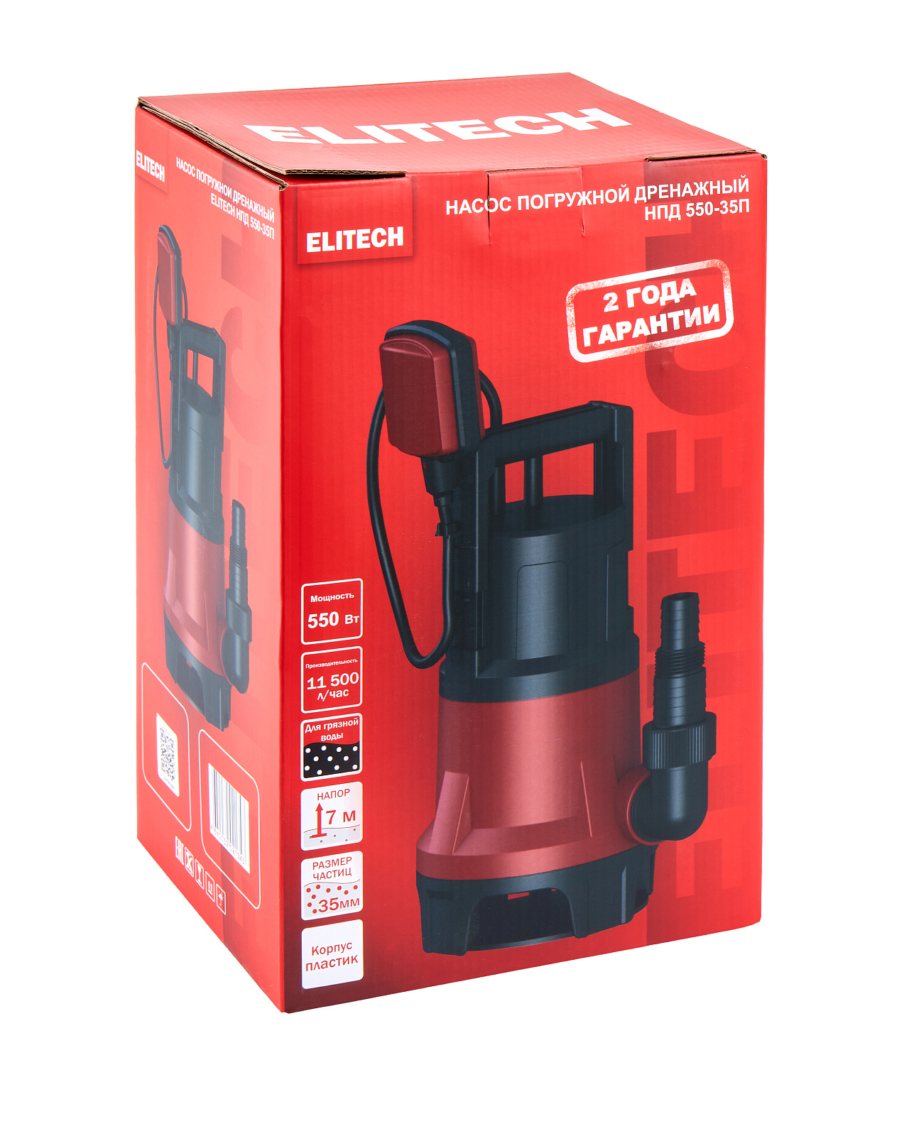 Погружной дренажный насос «ELITECH» мощностью 550 Вт и производительностью 11 000 л/час предназначен для перекачивания чистой пресной воды с диаметром твердых частиц не более 5 мм из колодцев, открытых водоемов, затапливаемых подвалов и других источников. Максимальная температура воды не должна превышать 35°С. Насос не предназначен для перекачивания едких, легковоспламеняемых и взрывчатых веществ (нефть, бензин, растворители), а также масел и жиров. Насос оснащен поплавковым выключателем, который позволяет ему работать в автоматическом режиме в зависимости от изменения уровня воды.
