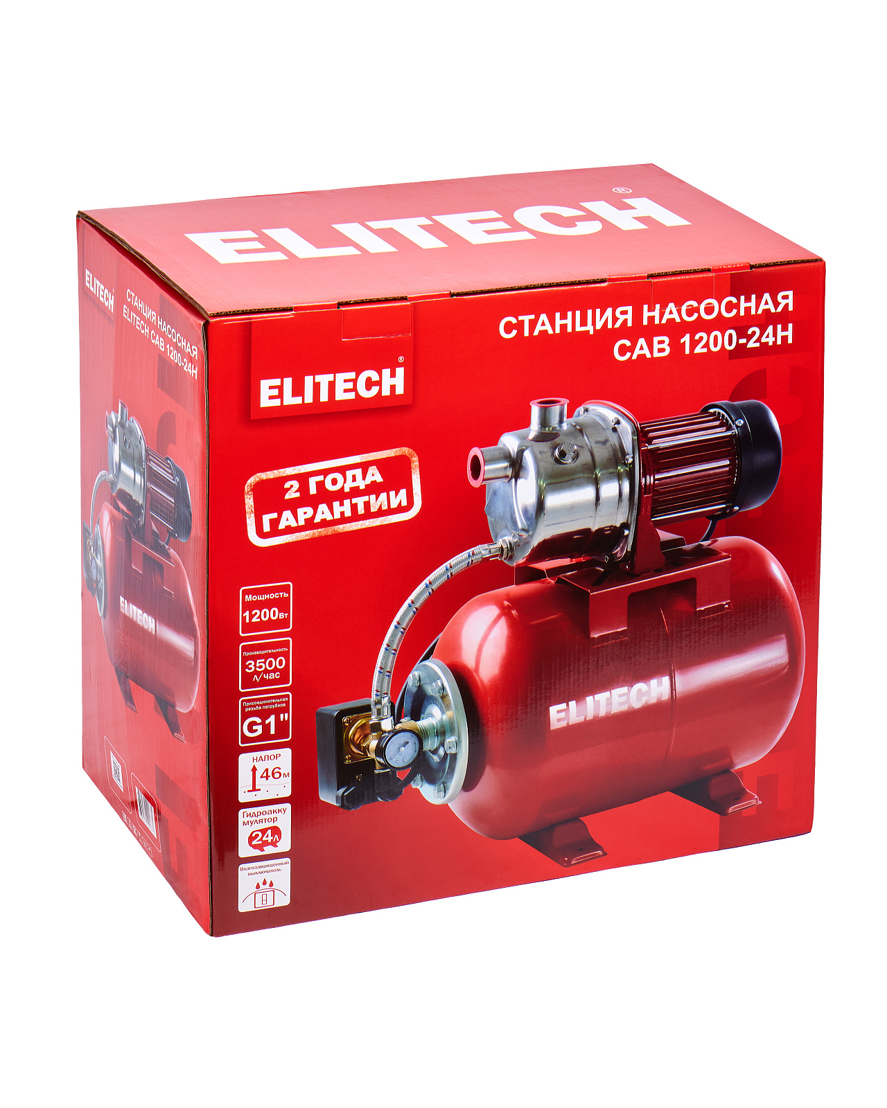 Насосная станция ELITECH САВ 1200-24Н. Ппредназначена для организации водоснабжения малоэтажных домов, повышения давления в системе водоснабжения (только при промежуточном включении), орошения садов и огородов, подачи чистой пресной воды в промышленности и сельском хозяйстве. Забор воды может осуществляться из колодцев, открытых водоемов и других источников, с глубины не более 8 м. При этом максимальная температура воды не должна превышать 35°С. Насосная станция не предназначена для подачи воды, содержащей абразивные, длинноволокнистые и химические составляющие. Насосную станцию нельзя использовать для подачи хлорсодержащей воды, например в плавательные бассейны.