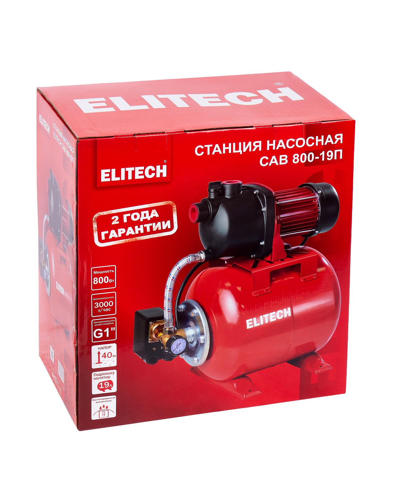 Насосная станция ELITECH САВ 800-19П. Предназначена для организации водоснабжения малоэтажных домов, повышения давления в системе водоснабжения (только при промежуточном включении), орошения садов и огородов, подачи чистой пресной воды в промышленности и сельском хозяйстве. Забор воды может осуществляться из колодцев, открытых водоемов и других источников, с глубины не более 8 м. При этом максимальная температура воды не должна превышать 35°С. Насосная станция не предназначена для подачи воды, содержащей абразивные, длинноволокнистые и химические составляющие. Насосную станцию нельзя использовать для подачи хлорсодержащей воды, например в плавательные бассейны.