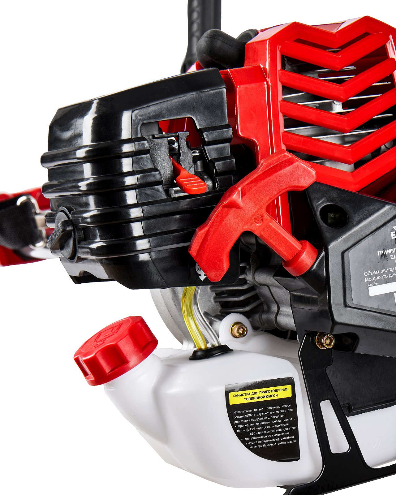 Бензиновый триммер для кошения травы леской (кордом 420 мм) и ножом (305 мм) с двухтактным двигателем мощностью 2,7 л.с. (2 кВт) выполнен с неразборной штангой.