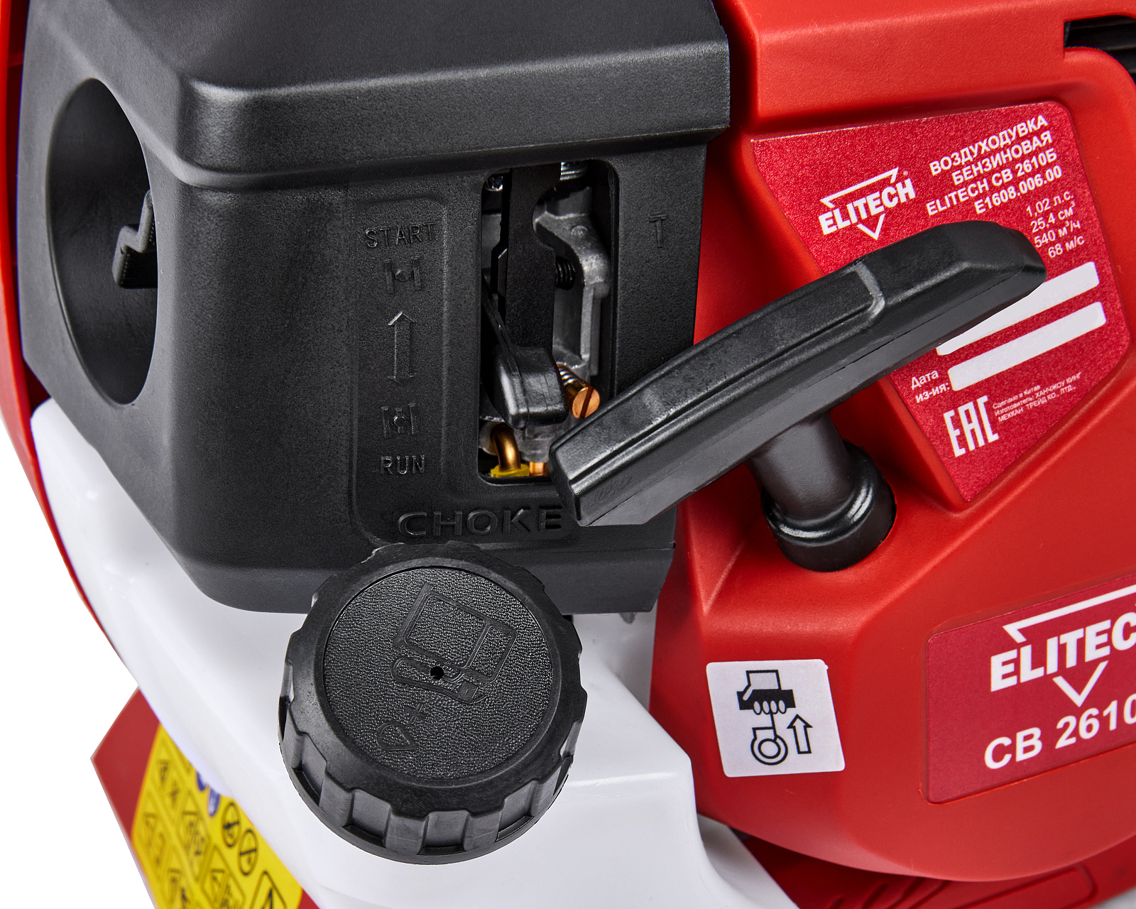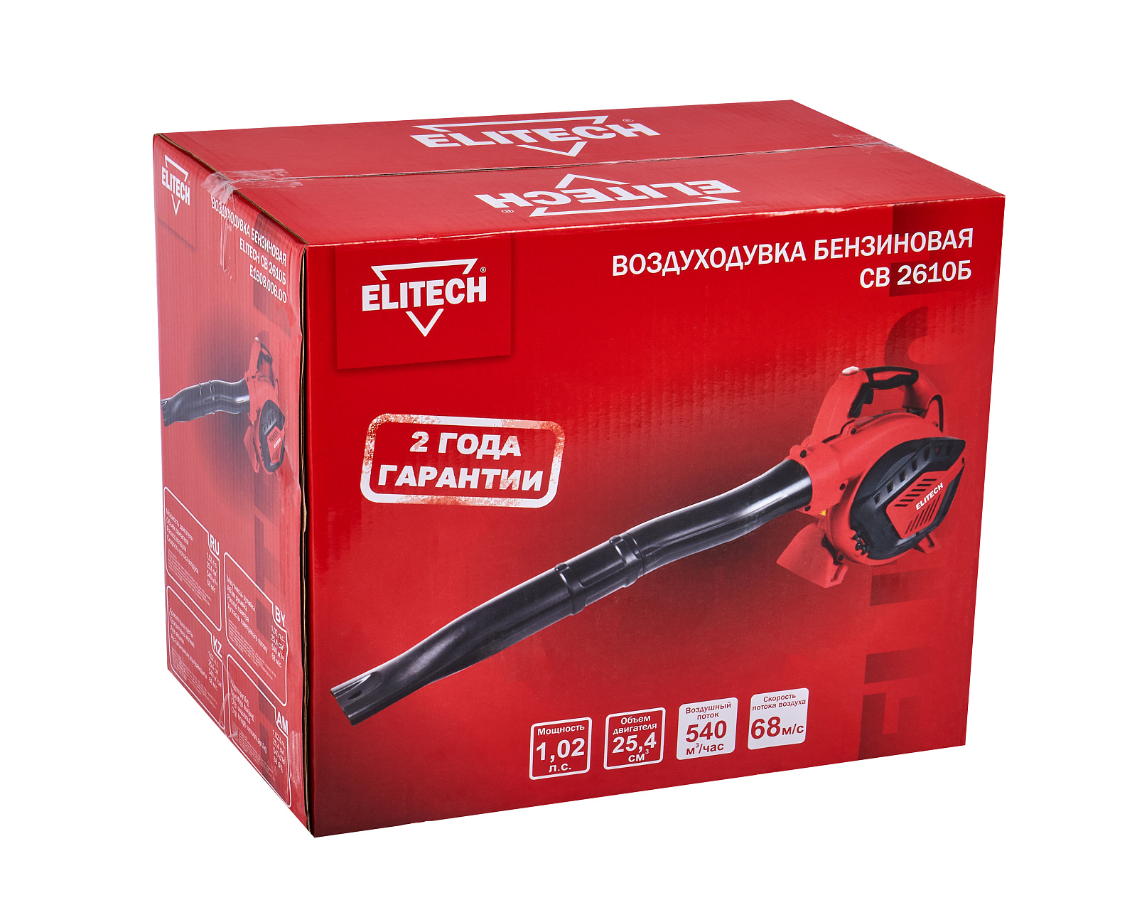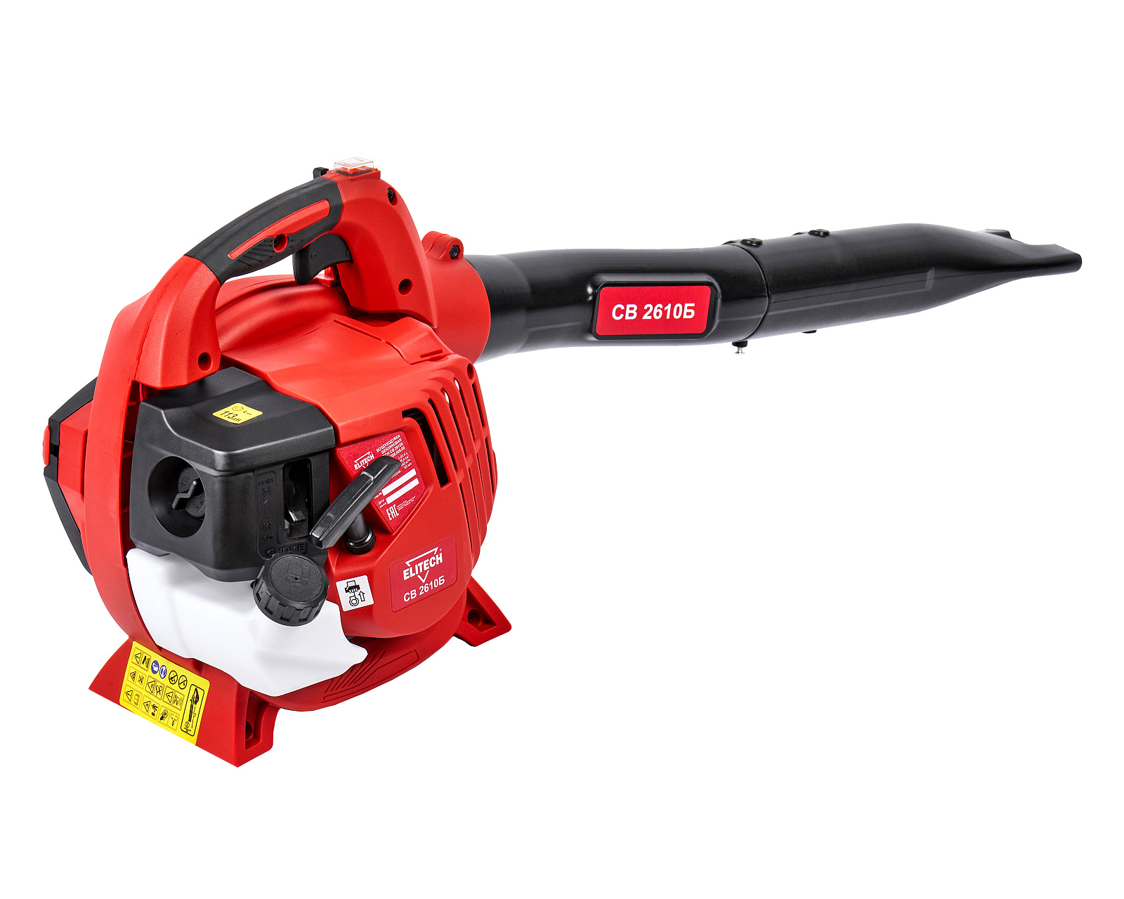 Бензиновая воздуходувка ELITECH СВ 2610Б (E1608.006.00). Предназначена для создания направленного воздушного потока для очистки территории от листвы, скошенной травы и мусора.