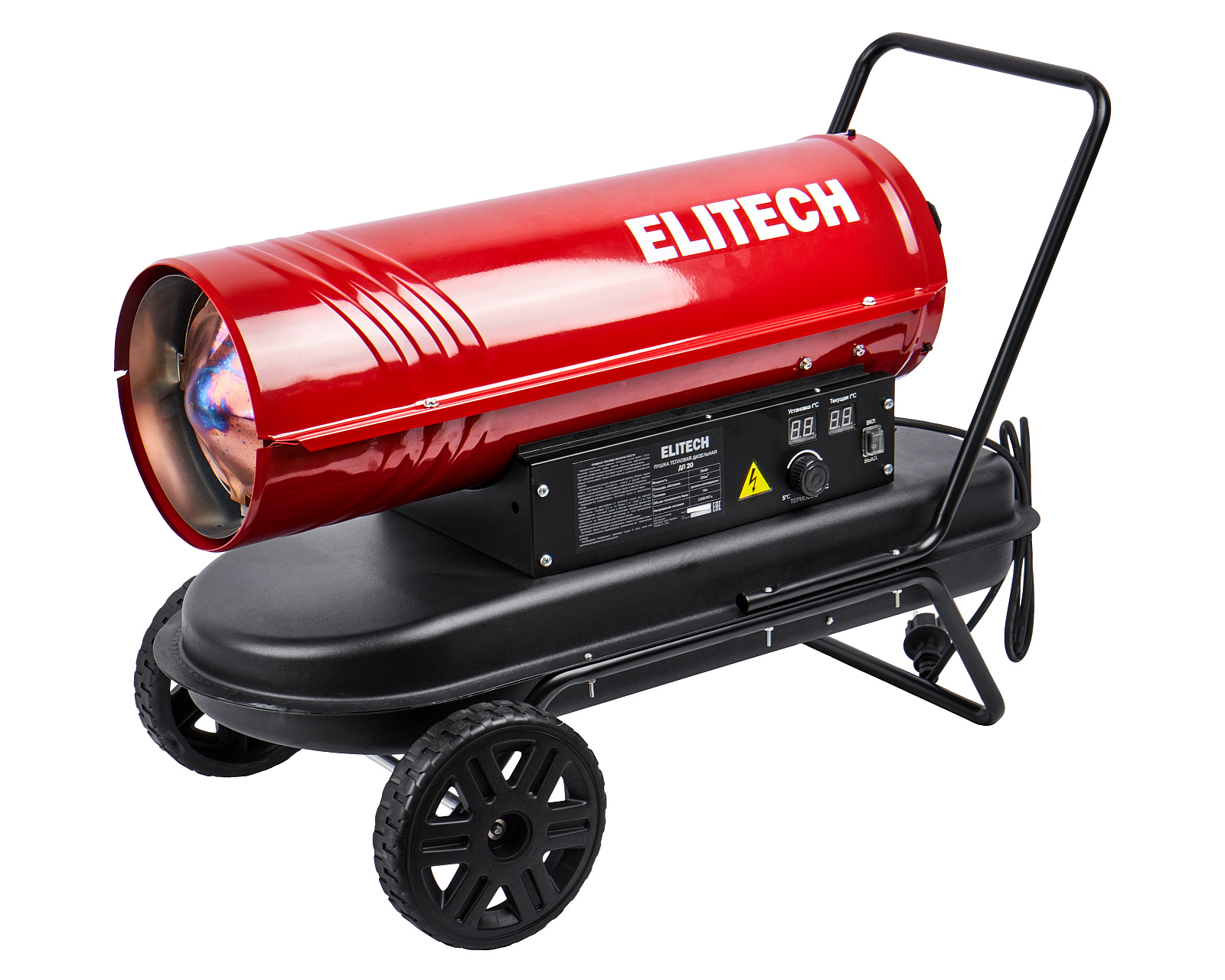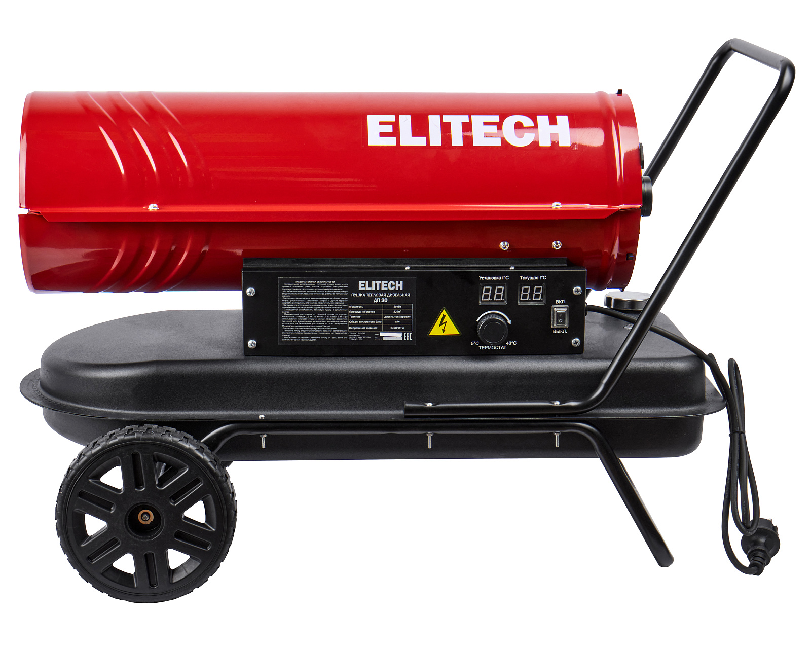 ELITECH Дизельная тепловая пушка прямого нагрева (или воздухонагреватель) ELITECH ДП 20. Предназначена для работы на открытых/полузакрытых площадках и временного обогрева/просушки хорошо проветриваемых помещений или с работающей приточно-вытяжной вентиляцией. Запрещено использовать воздухонагреватель в жилых помещениях и в помещениях с не функционирующей вентиляционной системой.