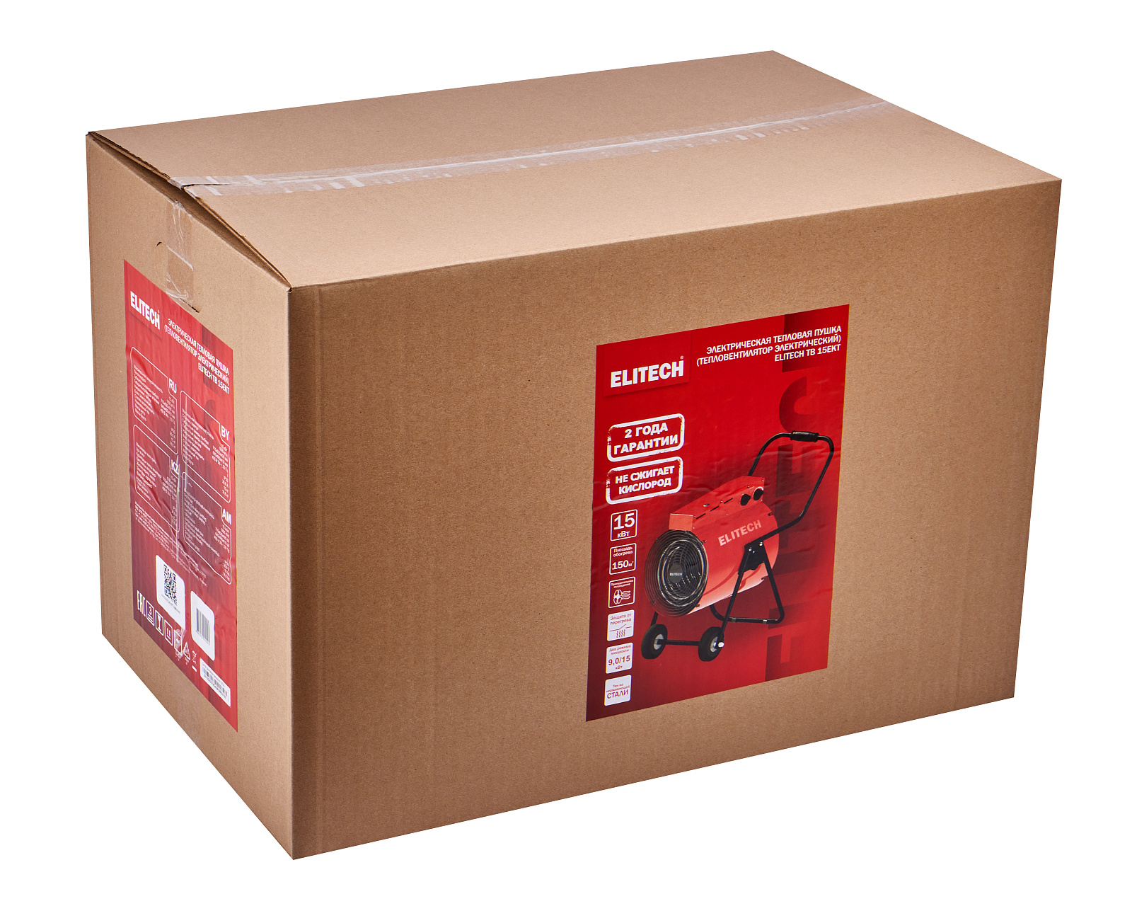 ELITECH Электрическая пушка Elitech ТВ 15ЕКТ – надежный долговечный агрегат, у которого максимальная мощность имеет величину 15 кВт. Предлагаемое устройство позволяет без проблем обогревать сравнительно большие помещения. Оно хорошо подходит для поддержания необходимой температуры на складах, на ремонтных и строительных площадках.