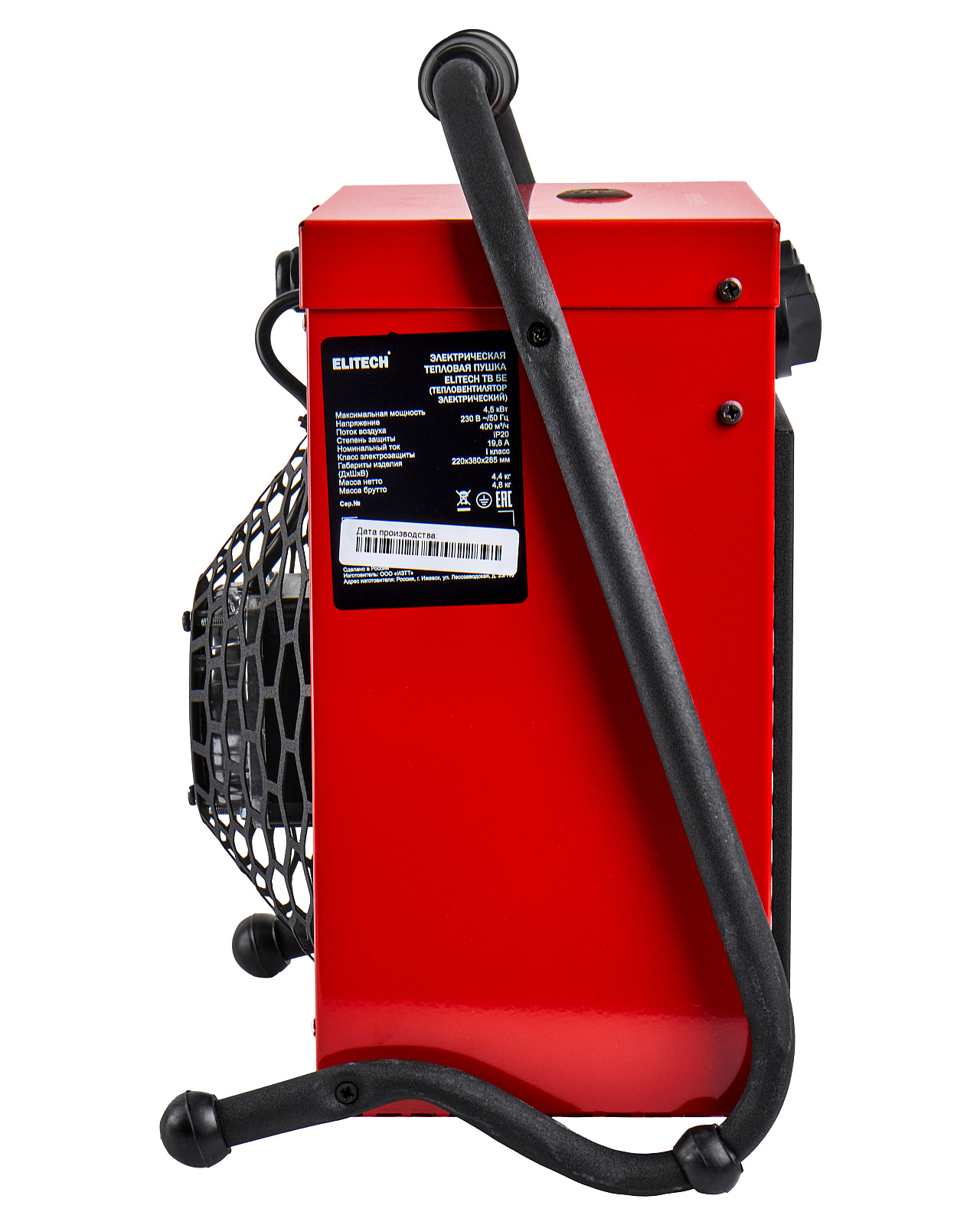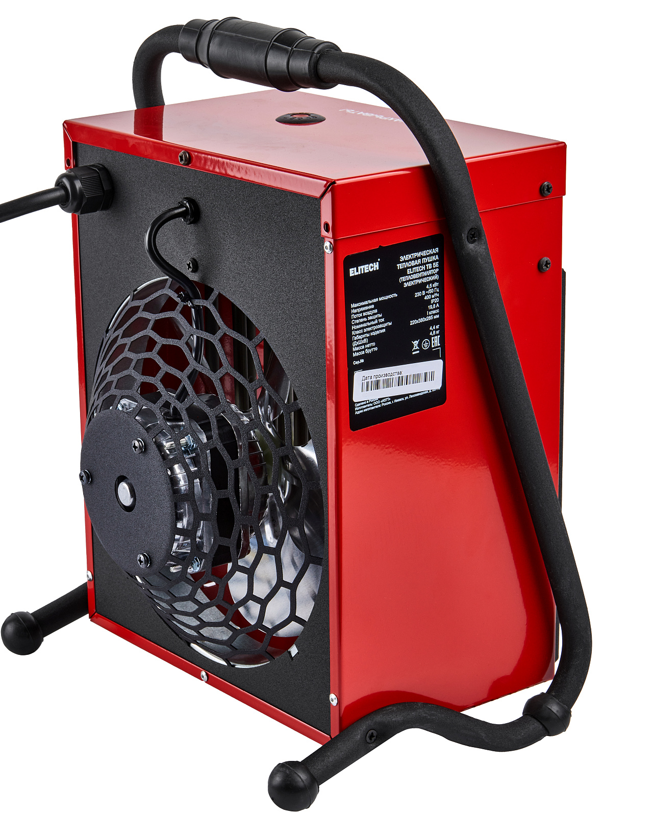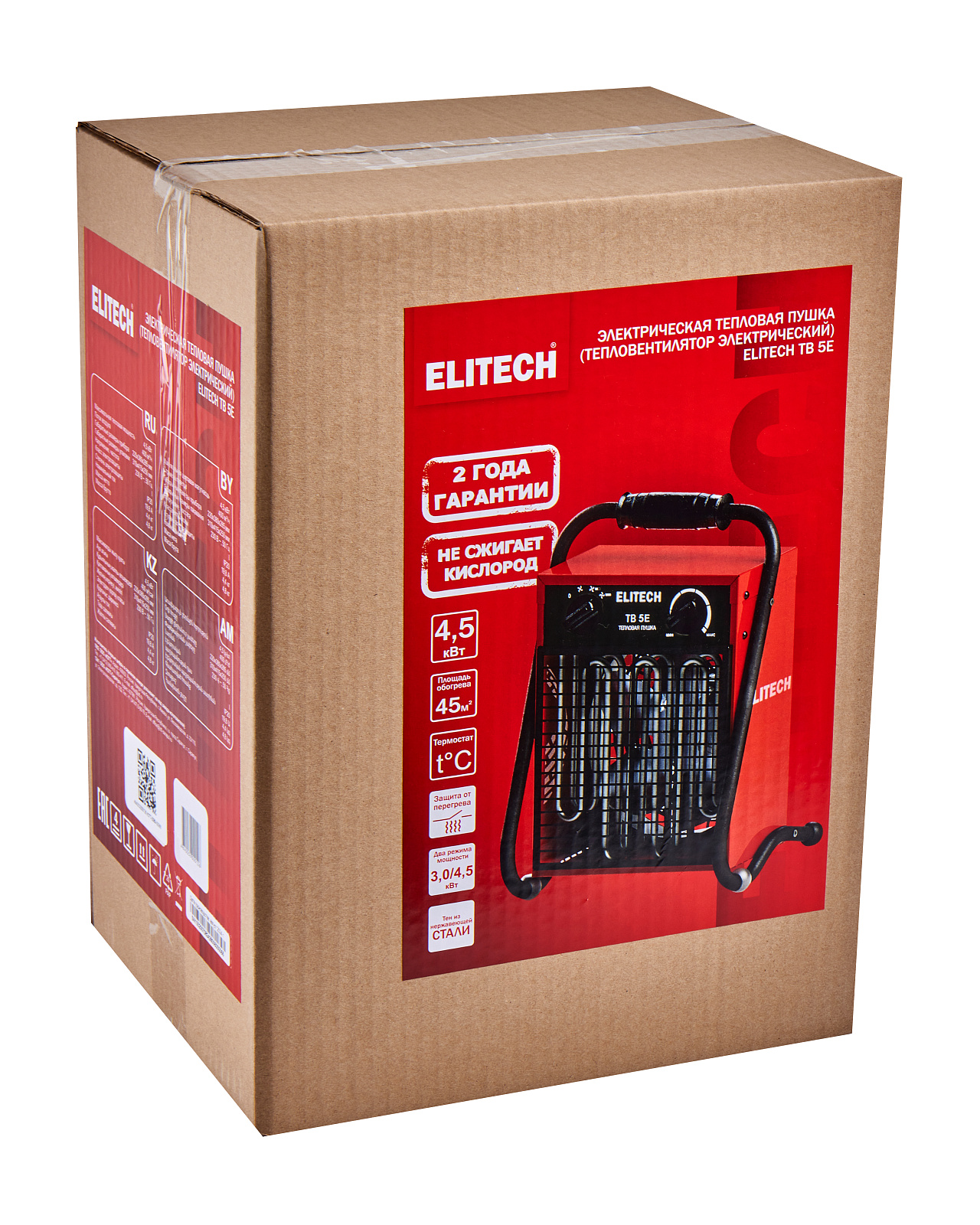 Электрическая тепловая пушка ELITECH ТВ 5Е • Два режима мощности нагрева 3кВт и 4,5кВт • Эффективная площадь обогрева до 45м2 • Электромагнитное реле управления • Встроенный термостат автоматически поддерживает заданную температуру нагрева воздуха • Встроенный термодатчик для защиты от перегрева • Тен из нержавеющей стали • Питание от однофазной сети Максимальная мощность 4,5 кВт Напряжение 230 В, 50 Гц Поток воздуха 400 м3/ч