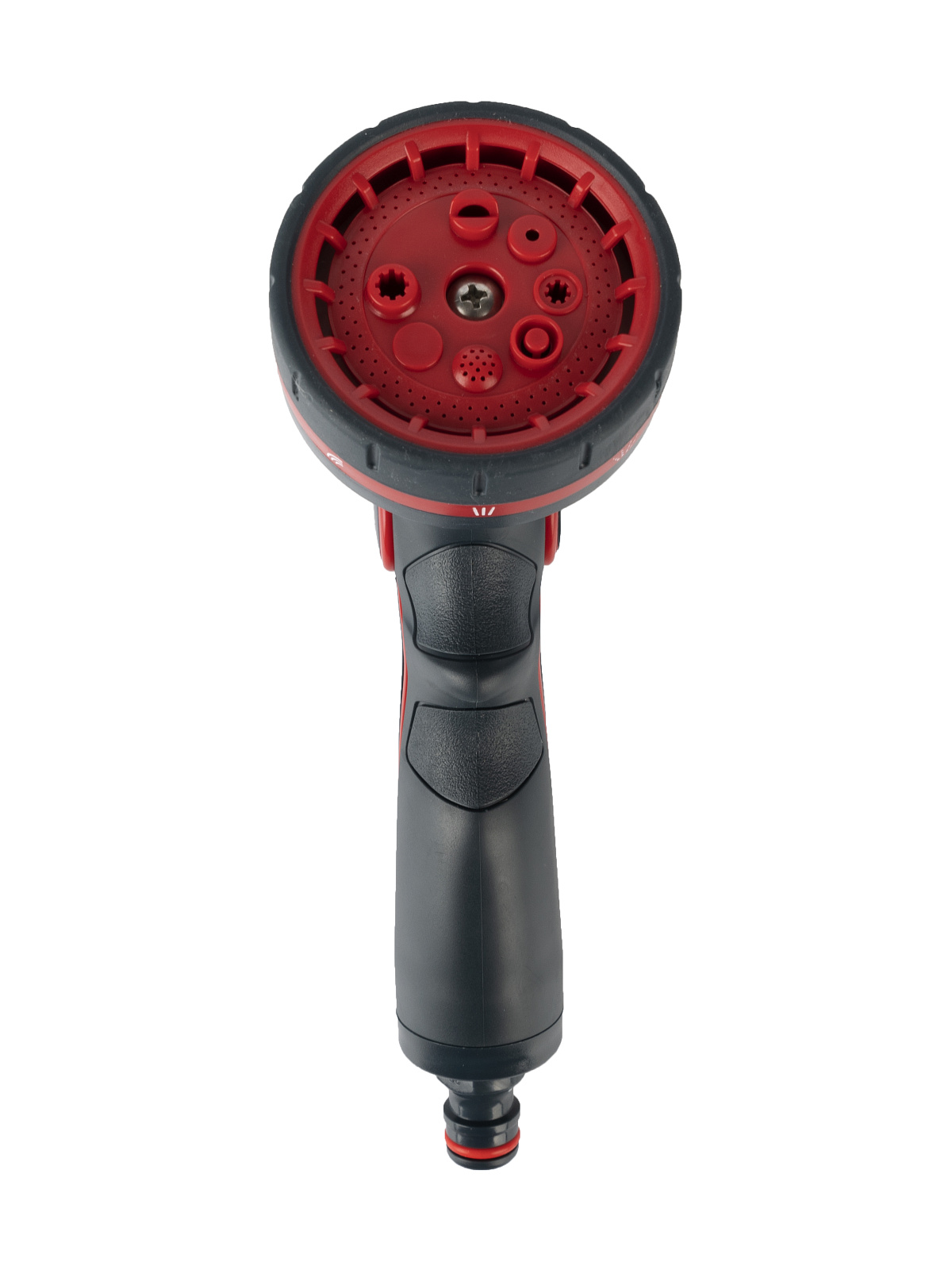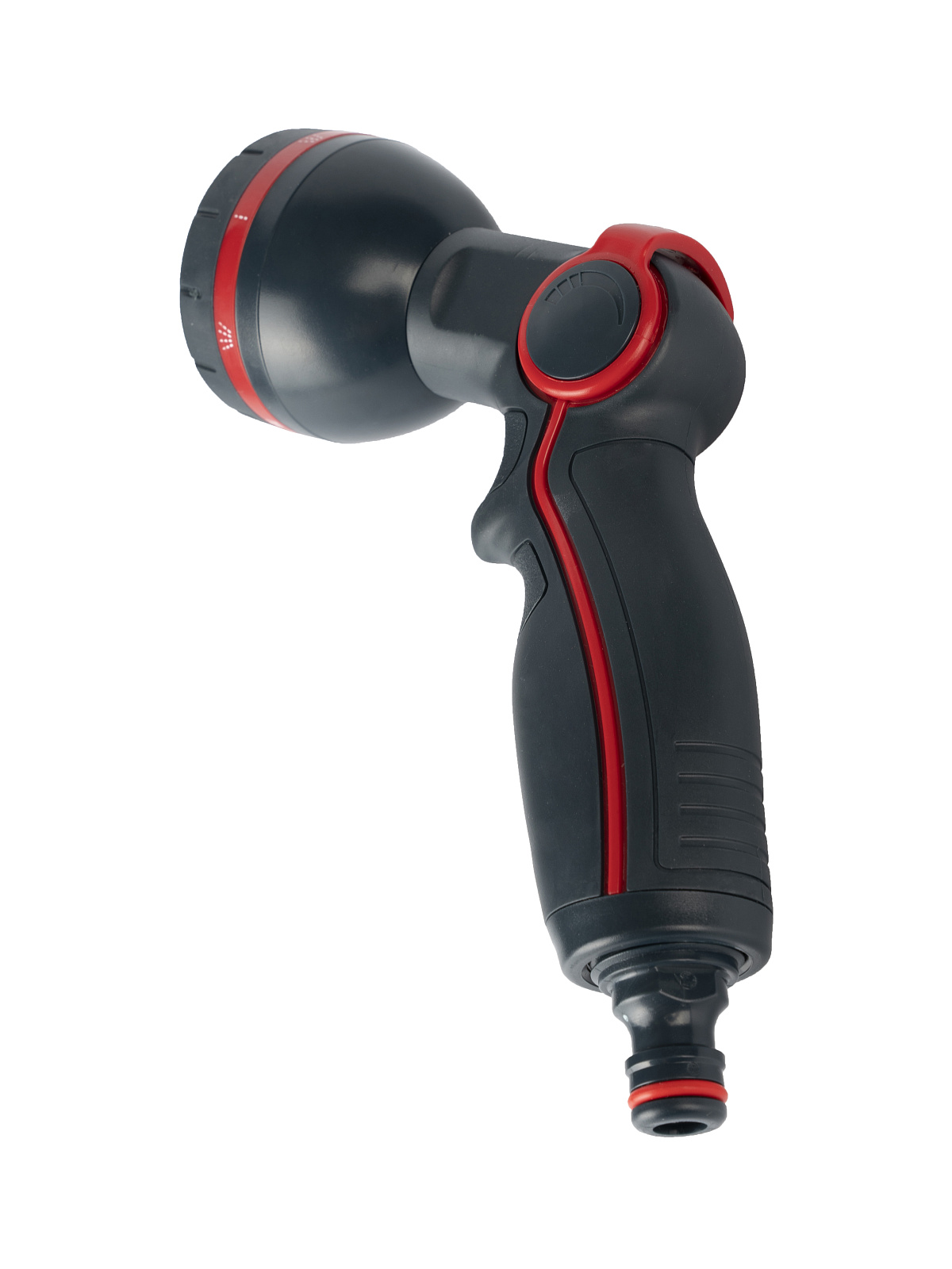 Пистолет-распылитель 8 режимов полива Материал: ABS, TPR Покрытие корпуса TPR мягкое на ощупь, устойчивое к нагреву и холоду, а также к скольжению, удобное в использовании; Задний спусковой крючок Пластиковый переходник Восемь легко настраиваемых режимов распыления: центральное, конусообразное, струйное, туманное, вертикальное, плоское, полное и душевое.