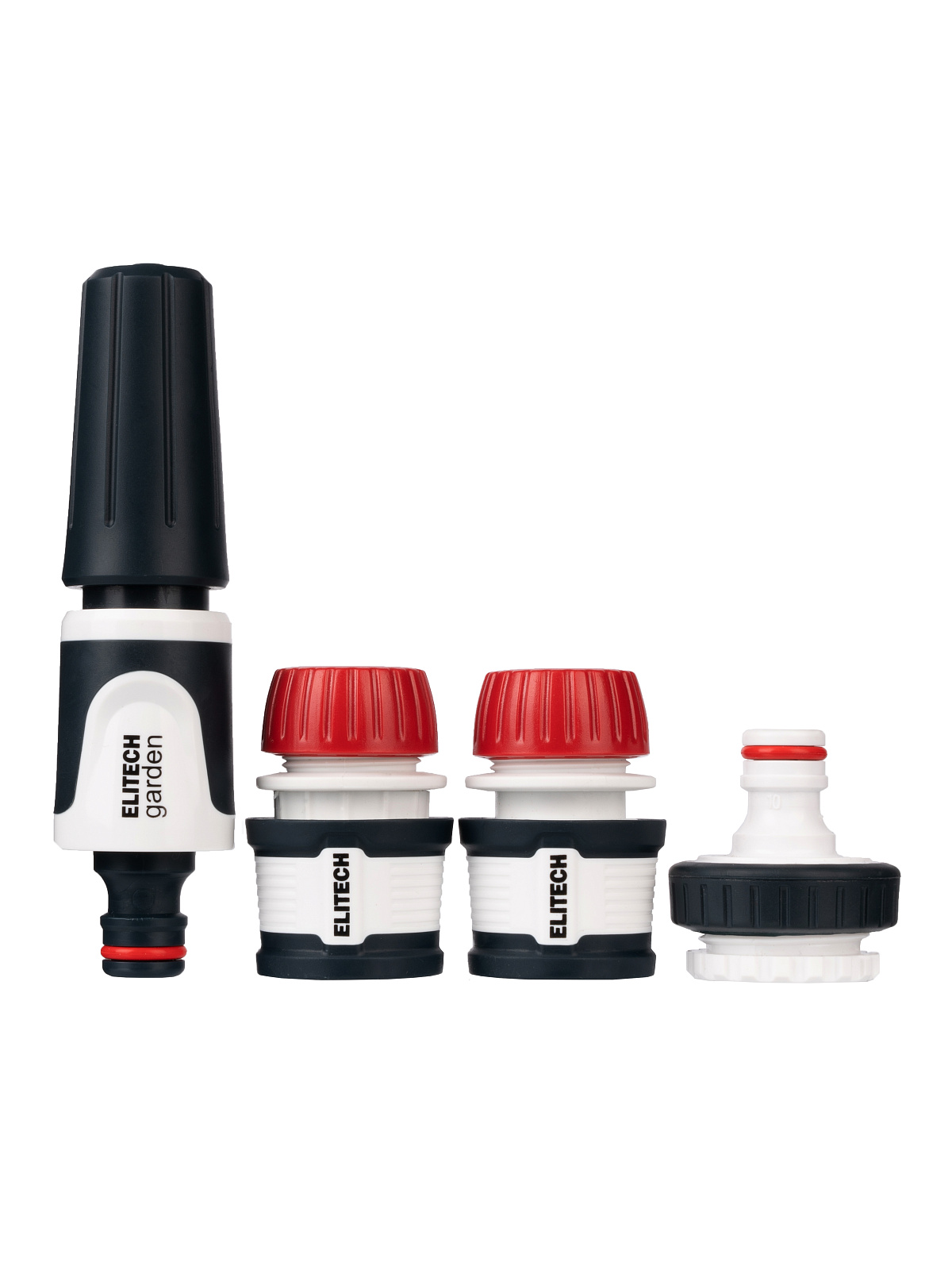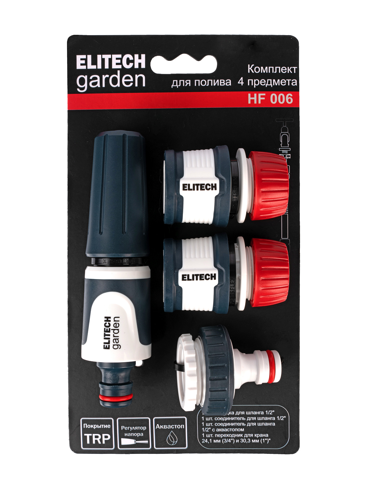 Набор для полива 4 предмета., премиум-класса В наборе: 1шт. насадка для шланга, 1шт. 1/2 " соединитель для шланга, 1шт. 1/2 " соединитель для шланга с аквастопом, 1шт. переходник для крана 24,1 мм (G3/4) и 30,3 мм (G1); Мягкая ручка; Материал: ABS, PP, TPR Рабочее давление: 4 бар