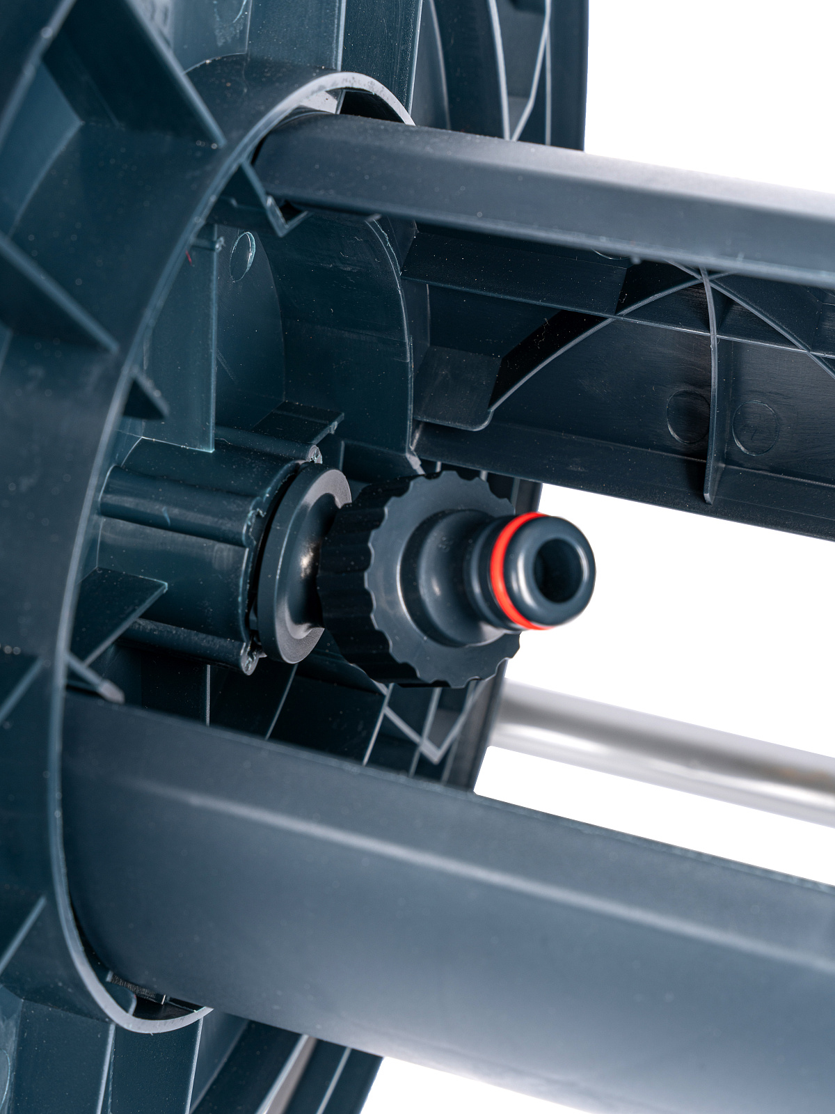 Телескопическая тележка для шлангов Максимальная вместимость: шланг 1/2 "x50 м Стальная труба: толщина 0,8 мм, диаметр 19 мм Пластиковый барабан с двумя соединительными планками, диаметр диска 36 см Диаметр колеса: 15 см Регулируется по высоте, 55,5-94,5 см.