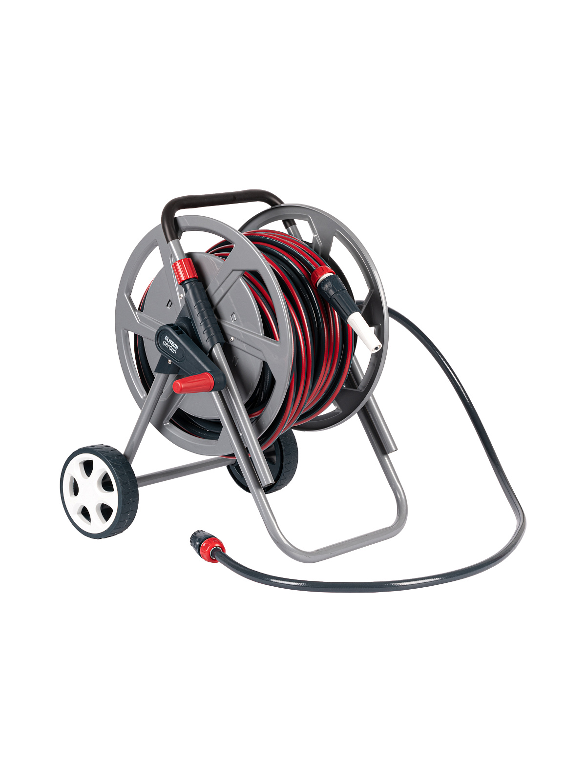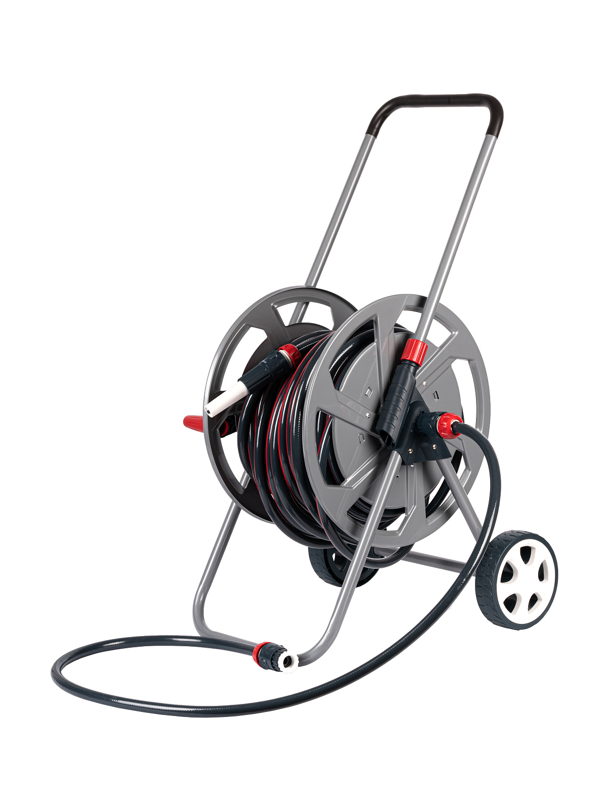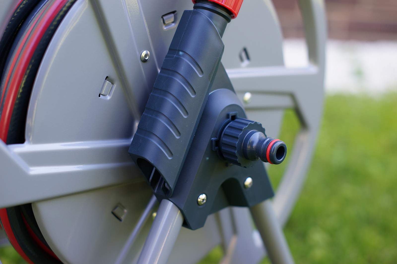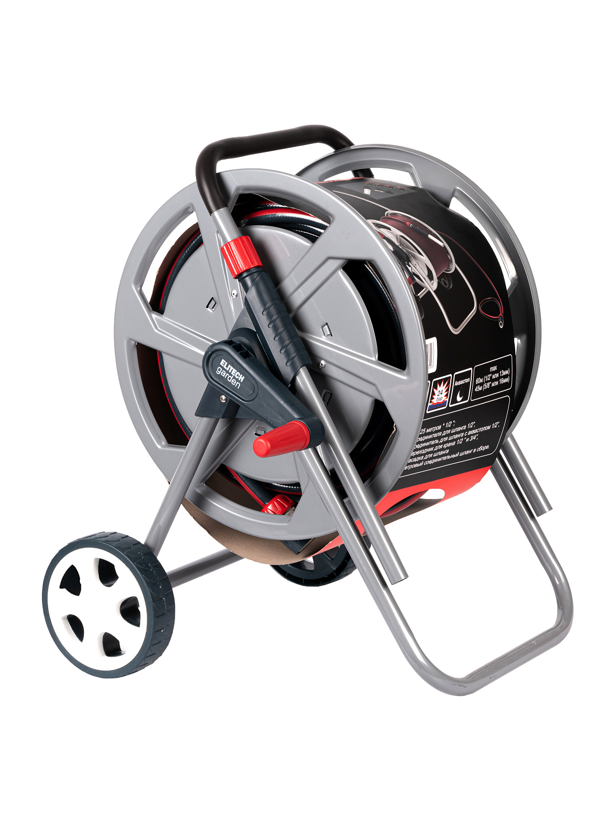 Особенности тележки для шлангов: Диаметр металлического барабана на колесном диске: 37,5 см; Ручка с мягким захватом; Диаметр колеса: 15 см; Подходит для использования со шлангом длиной до 60 м (1/2 дюйма или 13 мм) или 45 м (5/8 дюйма или 16 мм). Угловое соединение шланга предотвращает наматывание, перегиб или перекручивание шланга при включении и выключении. Диаметр цельнометаллической трубы: 19 мм; толщина: 0,8 мм, устойчива к ржавчине. Пластиковые колеса с плавным ходом бережны для газона