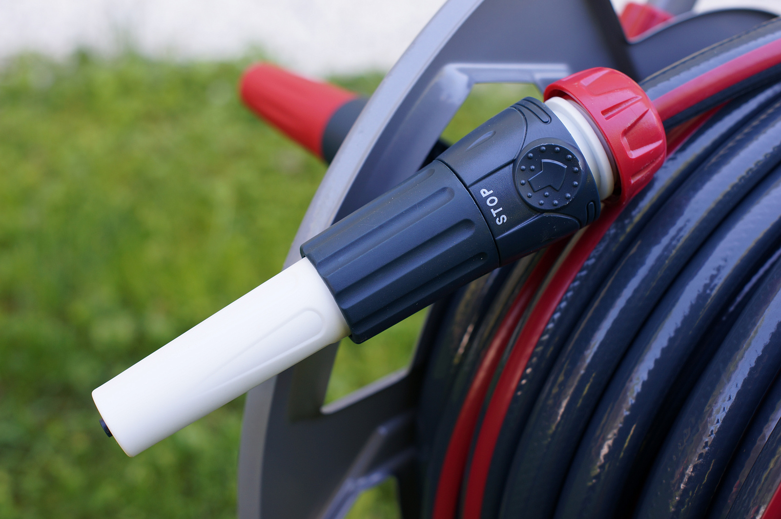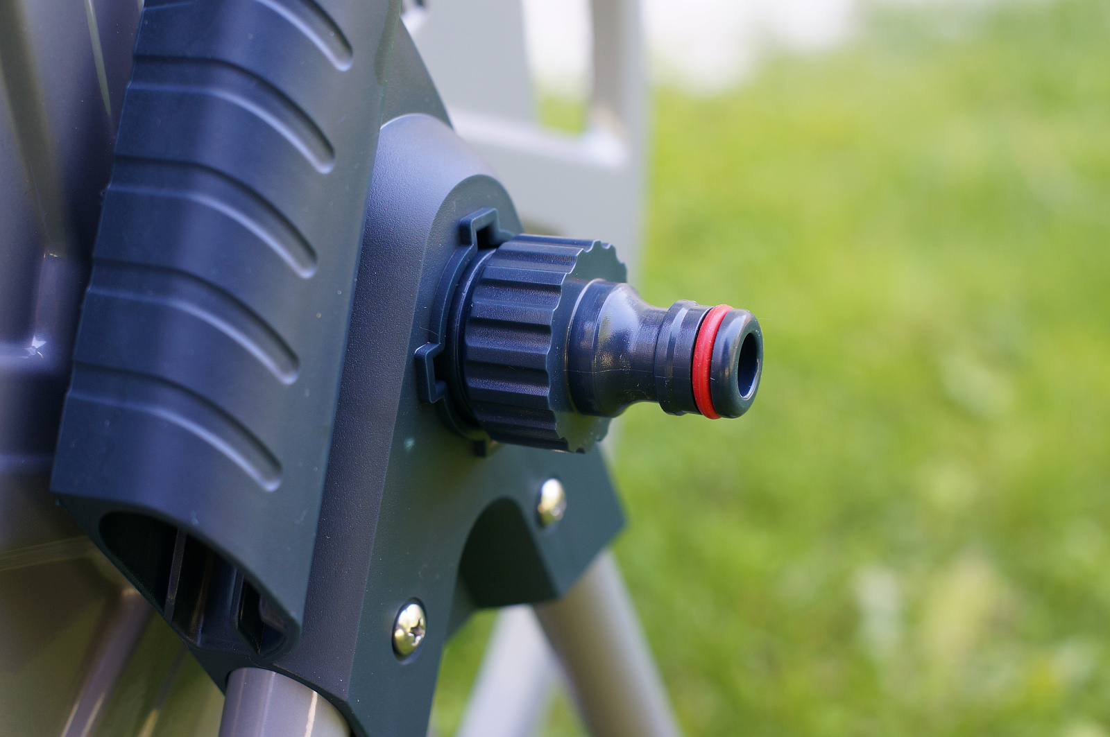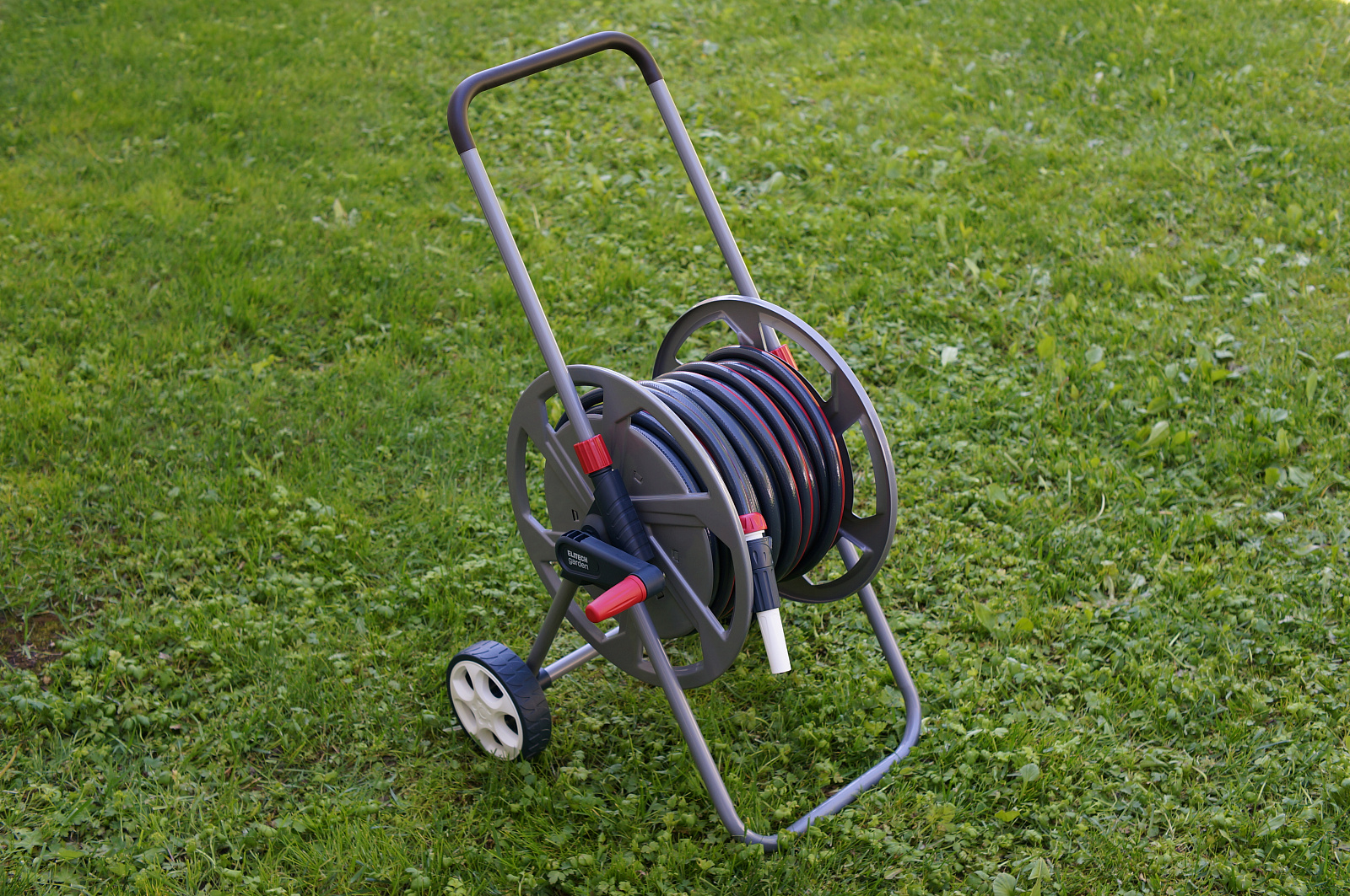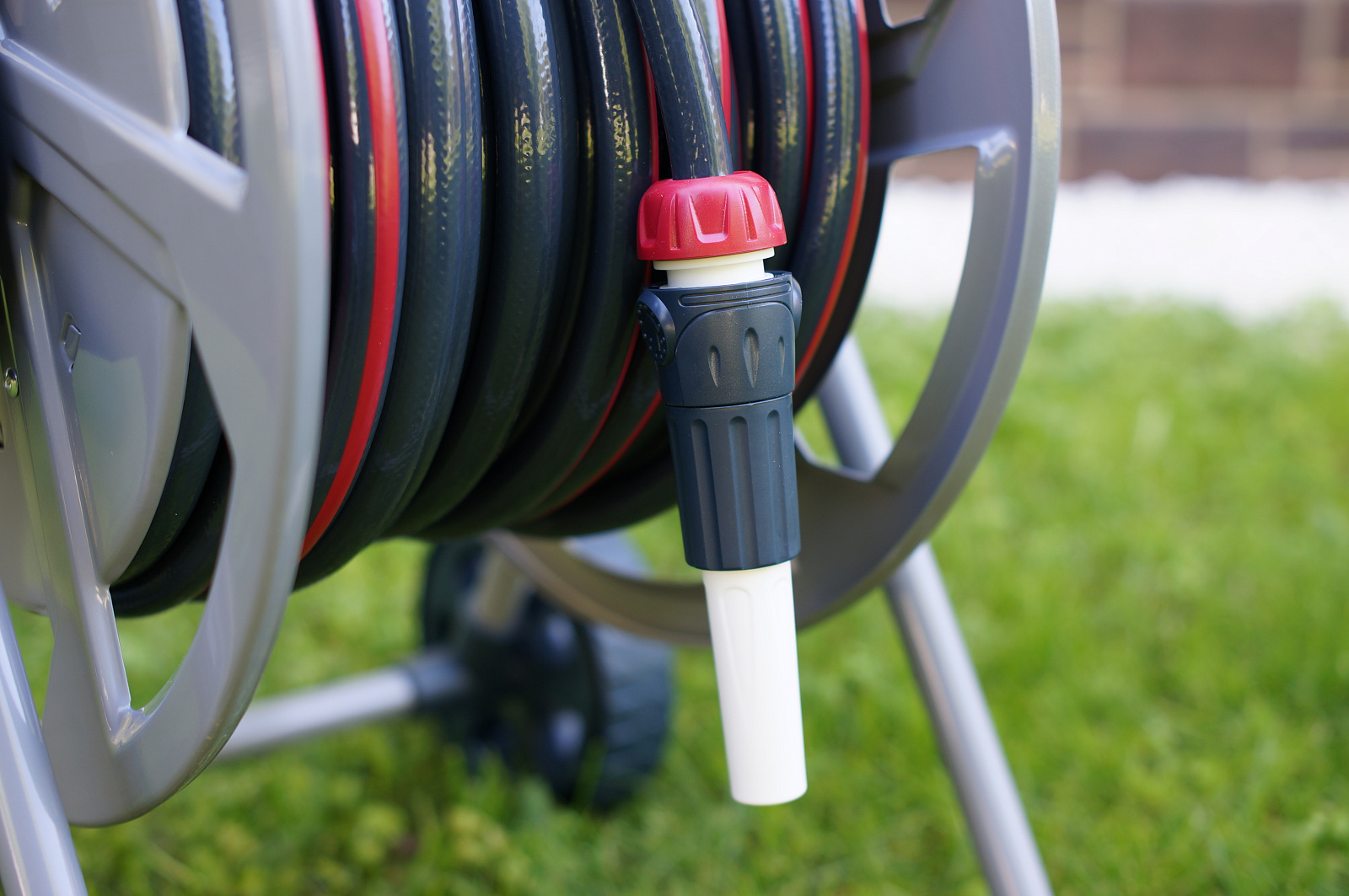 Особенности тележки для шлангов: Диаметр металлического барабана на колесном диске: 37,5 см; Ручка с мягким захватом; Диаметр колеса: 15 см; Подходит для использования со шлангом длиной до 60 м (1/2 дюйма или 13 мм) или 45 м (5/8 дюйма или 16 мм). Угловое соединение шланга предотвращает наматывание, перегиб или перекручивание шланга при включении и выключении. Диаметр цельнометаллической трубы: 19 мм; толщина: 0,8 мм, устойчива к ржавчине. Пластиковые колеса с плавным ходом бережны для газона