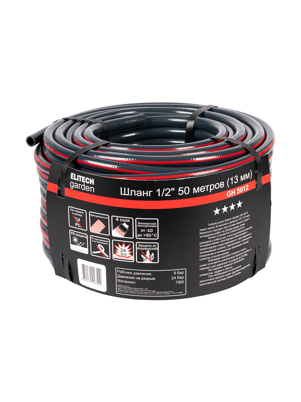 Давление на разрыв 24 бар.4 слоя.Армированный.УФ-защита.Защита от водорослей.Без кадмия и свинца. Не скручиваемый и не сминаемый.