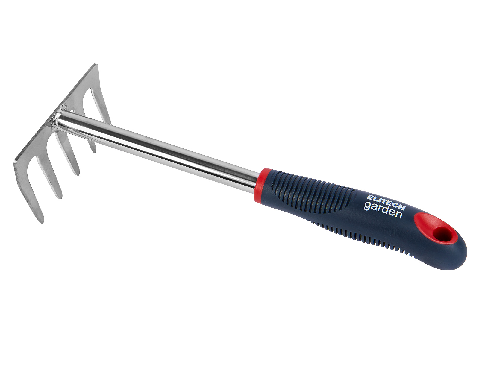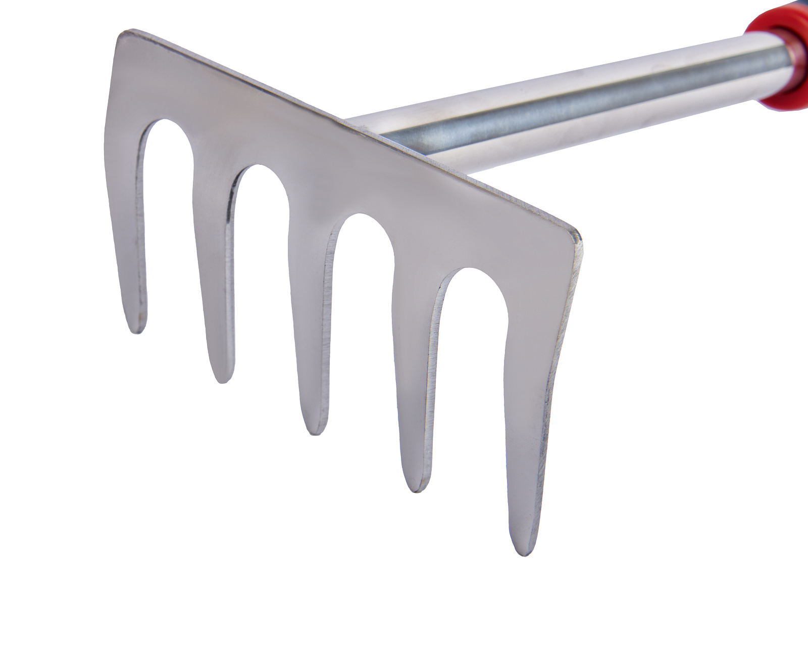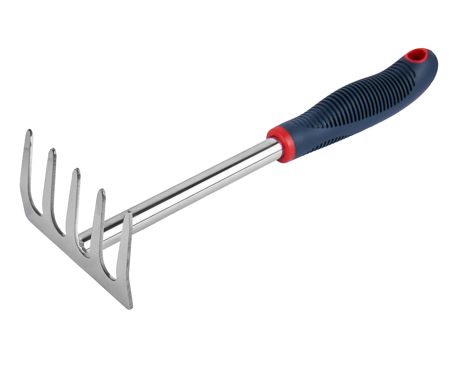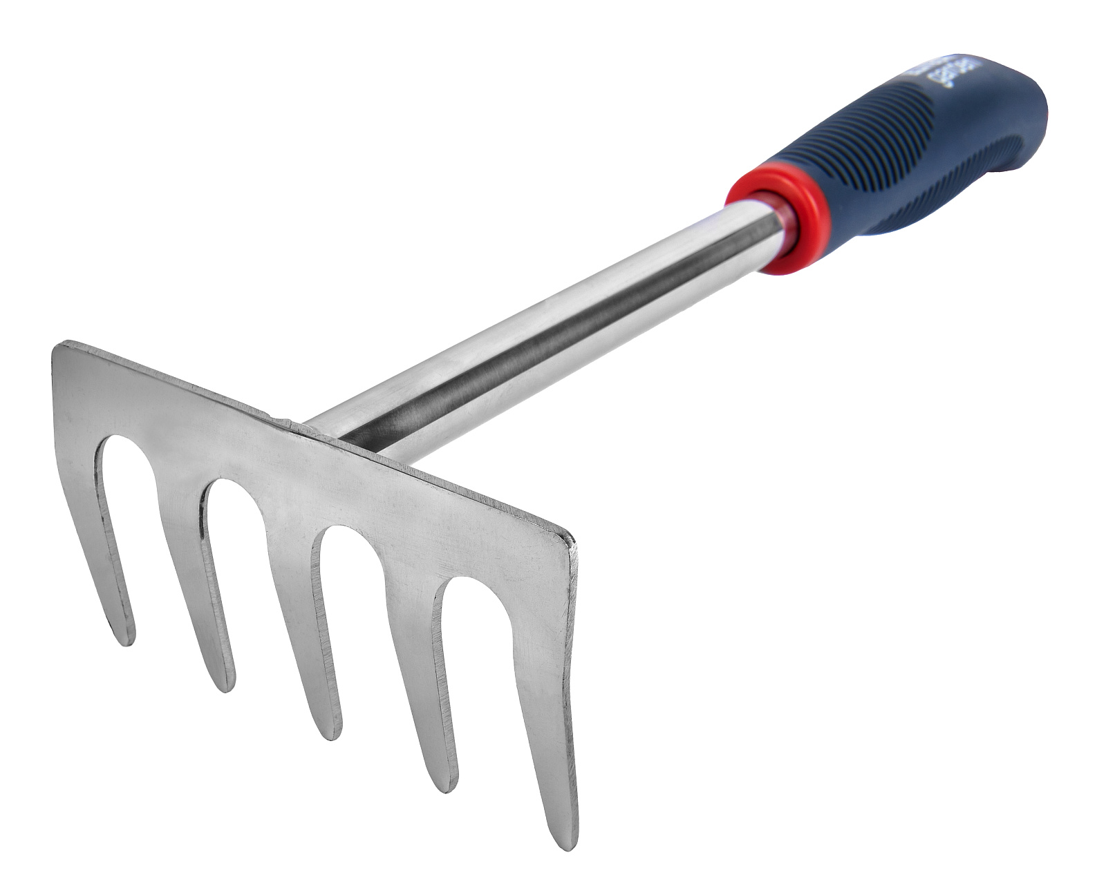 • Пятизубчатые прямые грабли из нержавеющей стали для удобного рыхления почвы. • Эргономичная ручка из нескользящего материала для комфортного захвата. • Отверстие для подвеса при хранении.