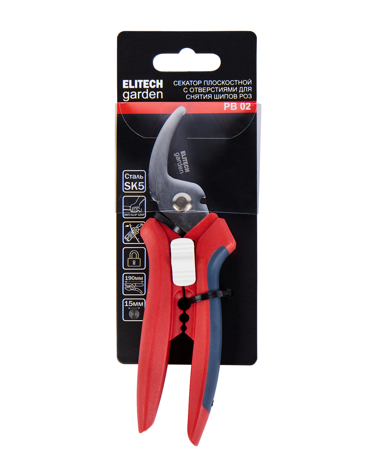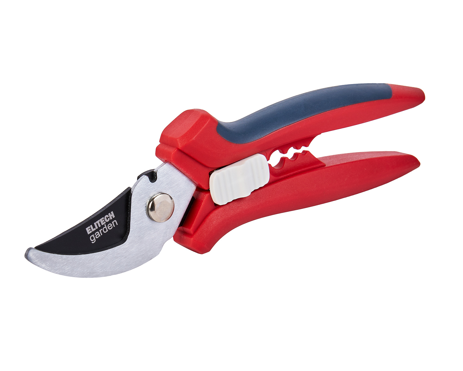 Плоскостной секатор длиной 190 мм используется для резки стеблей и веток максимальным диаметром до 15 мм, а также для удаления шипов роз. • Лезвия из углеродистой стали SK5 с антикоррозийным покрытием. • Эргономичные ручки с покрытием из нескользящего материла для комфортного захвата. • Пружинящая конструкция автоматически открывается после каждого среза. • Специальные отверстия быстро и легко удаляют шипы роз, лишнюю листву и другие растительные элементы с поверхности стебля. • Для качественной заточки лезвий рекомендуется использовать точилку для режущего инструмента Elitech garden MS 7C.