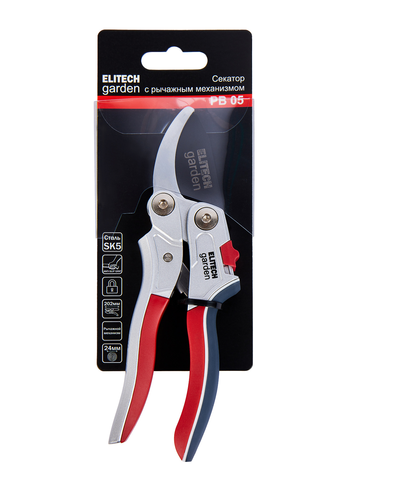 Секатор длиной 202 мм с храповым механизмом используется для резки стеблей и веток максимальным диаметром до 24 мм. • Лезвия из углеродистой стали SK5 с антикоррозийным покрытием. • Эргономичные ручки с покрытием из нескользящего материла для комфортного захвата. • Пружинящая конструкция автоматически открывается после каждого среза. • Рычажный механизм позволяет в три раза сократить усилие при срезании ветки того же размера. • Для качественной заточки лезвий рекомендуется использовать точилку для режущего инструмента Elitech garden MS 7C.