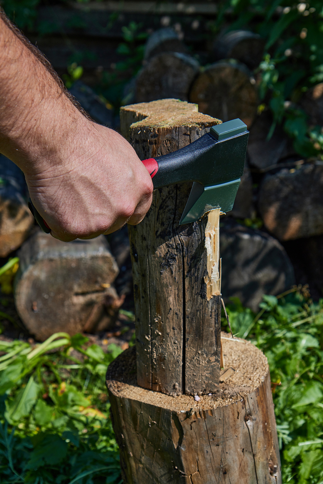 Походный топор длиной 230 мм и массой 550 г используется для рубки древесных материалов. • Лезвие из высококачественной углеродистой стали со специальным тефлоновым покрытием значительно снижает сопротивление трению, облегчает проникновение в древесину и способствует меньшему налипанию древесной смолы. • Сбалансированный центр тяжести обеспечивает правильное распределение массы и повышенную силу удара и раскалывания. • Легкая рукоять из фибергласса с дополнительным покрытием нейлоном не скользит в руках и амортизирует удар, снижая нагрузку на руки. • Форма рукояти в виде крючка на конце способствует безопасности при скольжении рук вверх и вниз по рукоятке.