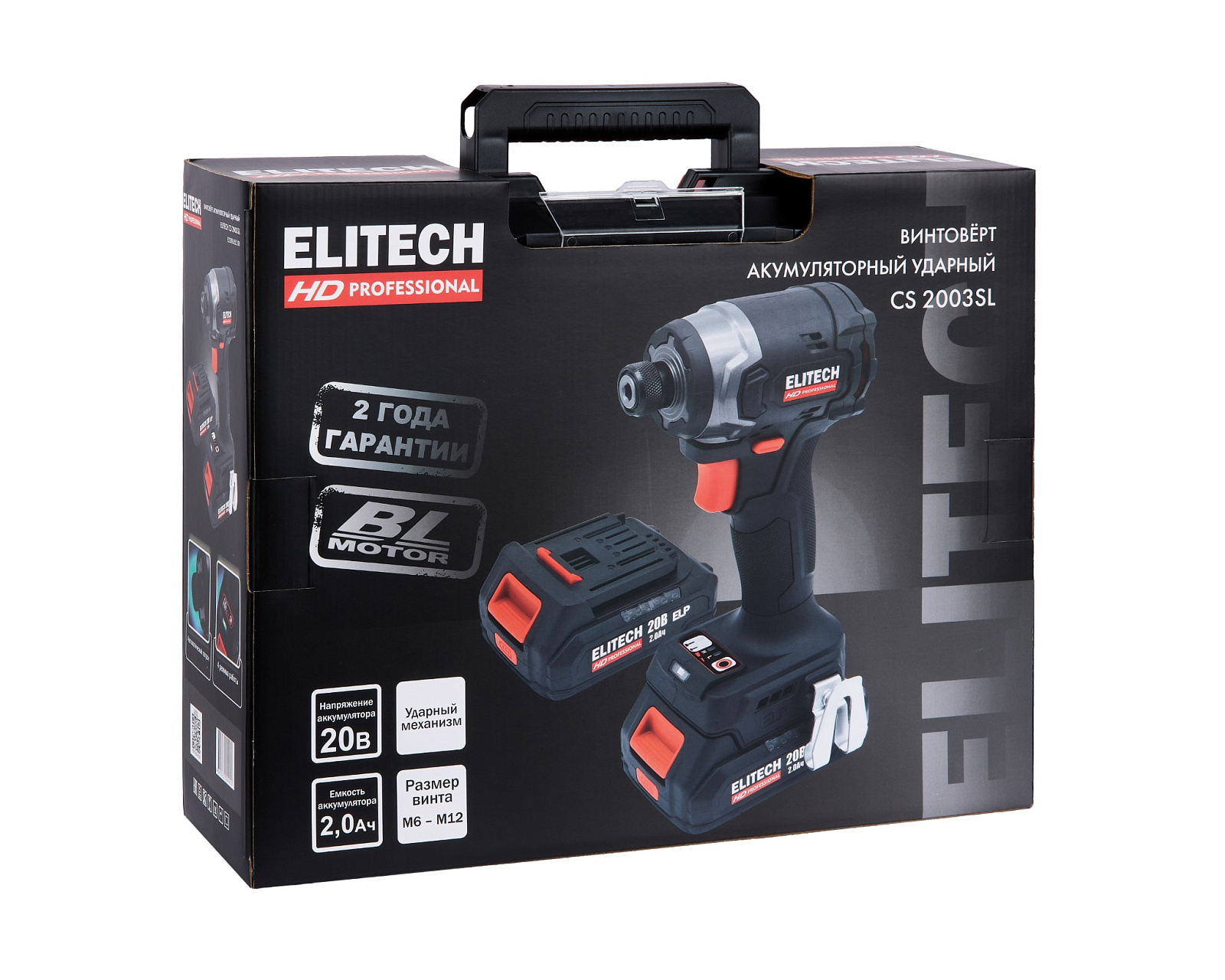 Винтовёрт аккумуляторный ударный без щеточный ELITECH HD CS 2003SL (E2201.055.01) 20В, 2х2, 0Ач, ELP, 0-3600у\м, 330Нм, кв 1\4", 1.2кг, ч, М6-М12, чемодан, подветка.