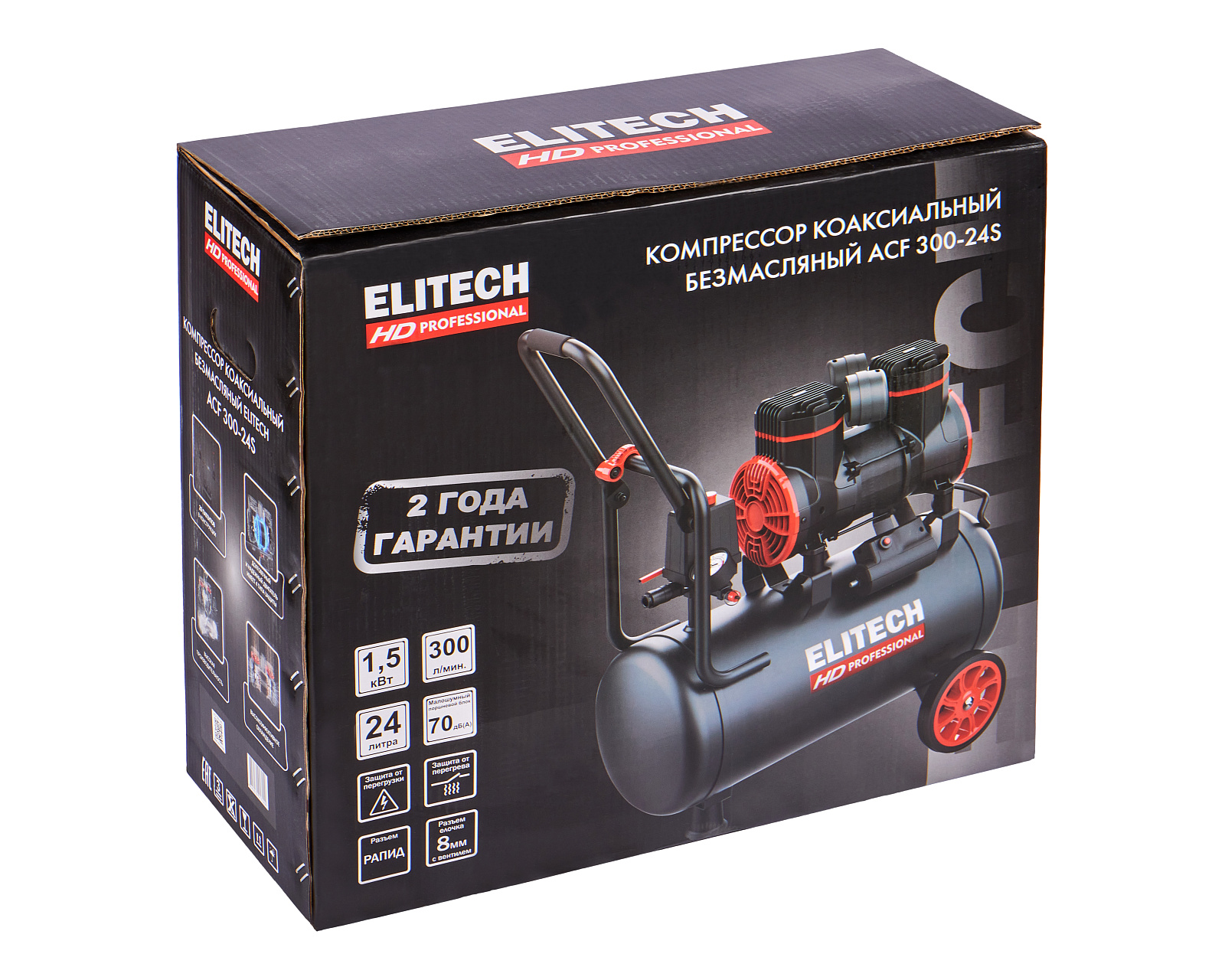 ELITECH HD PROFESSIONAL Компрессор ELITECH HD ACF 300-24S. Предназначен для подачи сжатого воздуха. Компрессор используется для работы с пневмоинструментом раскопультами, мовильными и продувочными пистолетами, пистолетами для накачки шин. Использование компрессора не по назначению запрещено