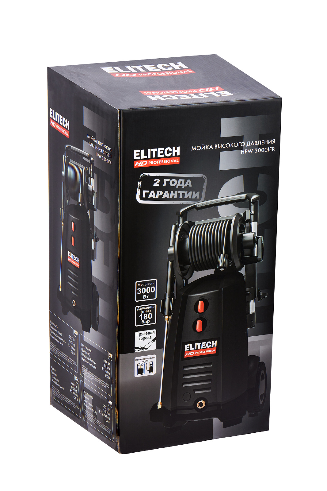 ELITECH HD PROFESSIONAL Мойка высокого давления ELITECH HD HPW 3000IFR. Предназначена для мойки автомобилей и любой другой техники, террас, тротуарной и фасадной плитки, фасадов зданий, а также для прочистки дождевых сливов. Мойка должна работать только с чистой водой без механических примесей. Для бесконтактной мойки с применением пеногенератора используется специальное средство, предназначенное для этих целей.