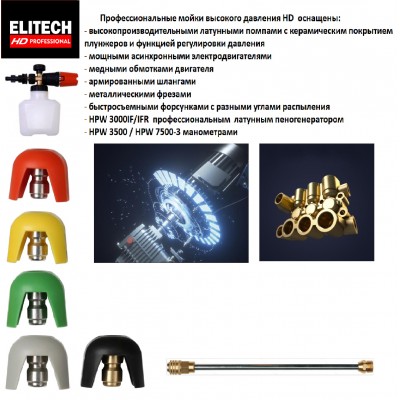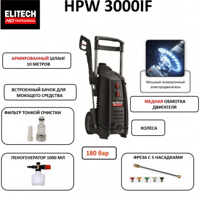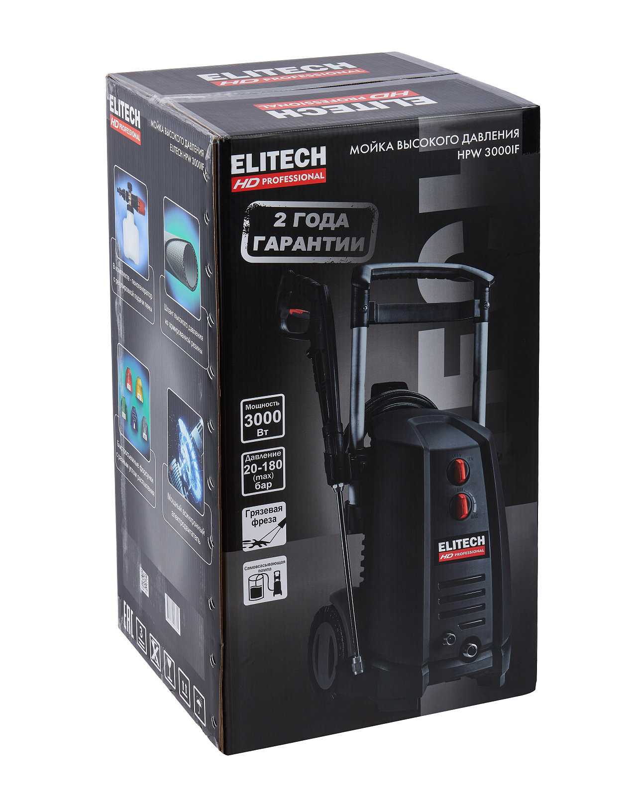 ELITECH HD PROFESSIONAL Мойка высокого давления ELITECH HD HPW 3000IF. Предназначена для мойки автомобилей и любой другой техники, террас, тротуарной и фасадной плитки, фасадов зданий, а также для прочистки дождевых сливов. Мойка должна работать только с чистой водой без механических примесей. Для бесконтактной мойки с применением пеногенератора используется специальное средство, предназначенное для этих целей.