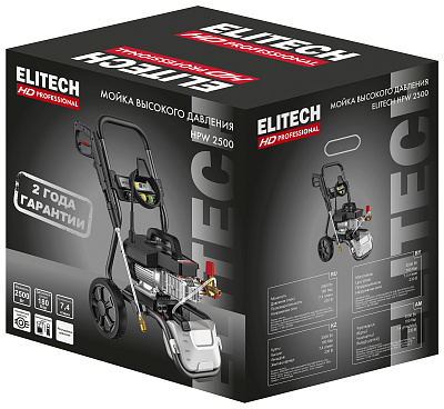 ELITECH HD PROFESSIONAL Мойка высокого давления ELITECH HD HPW 2500.П редназначена для мойки автомобилей и любой другой техники, террас, тротуарной и фасадной плитки, фасадов зданий, а также для прочистки дождевых сливов. Мойка должна работать только с чистой водой без механических примесей. Для бесконтактной мойки с применением пеногенератора используется специальное средство, предназначенное для этих целей. ЗАПРЕЩАЕТСЯ! использовать мойку для распыления химикатов, реагентов, пестицидов, гербицидов и других химических веществ.