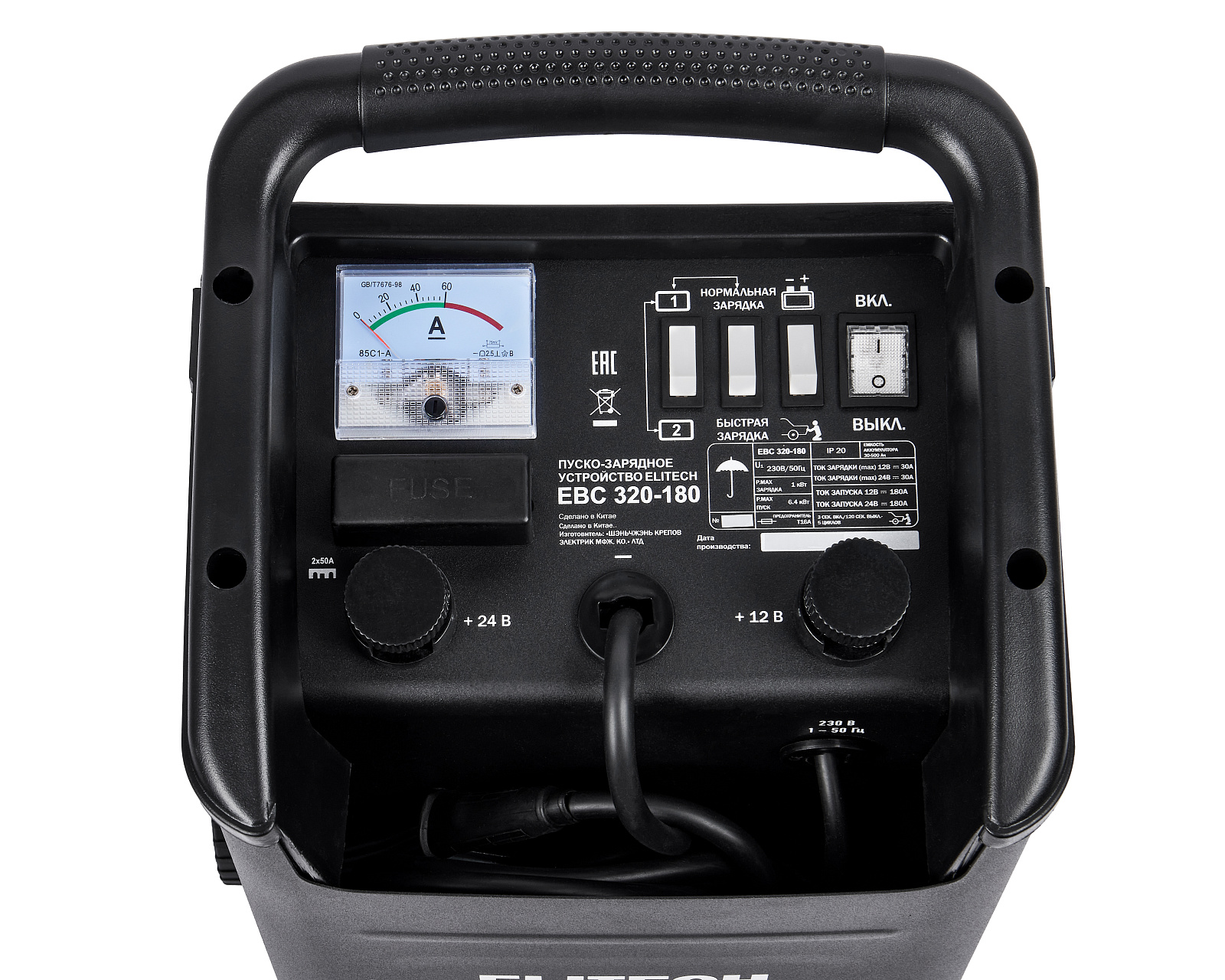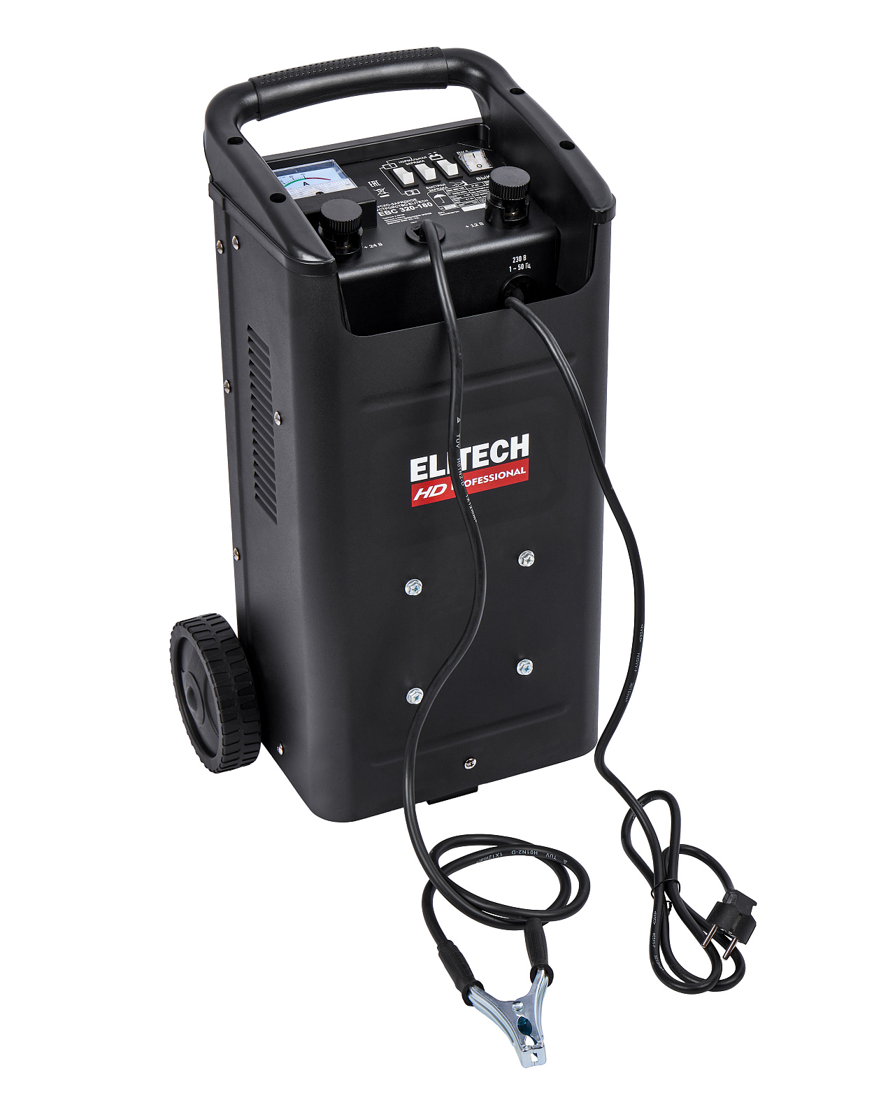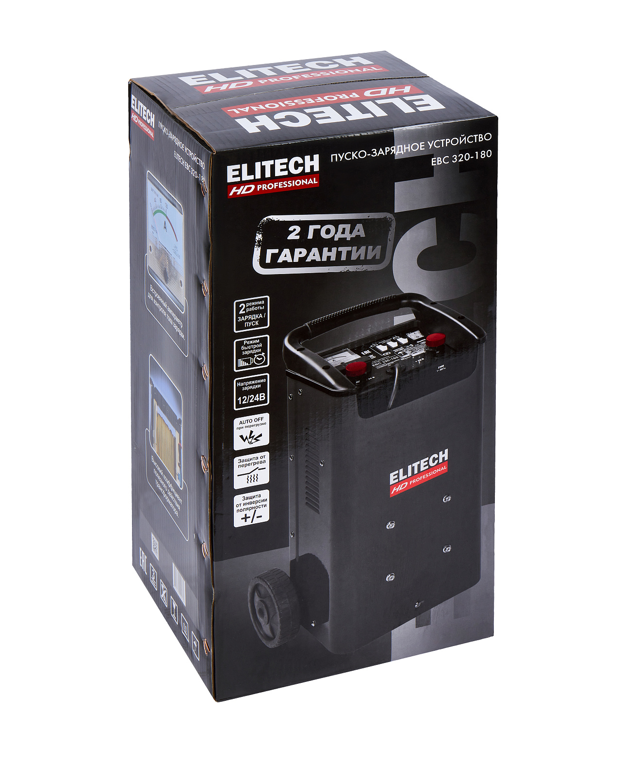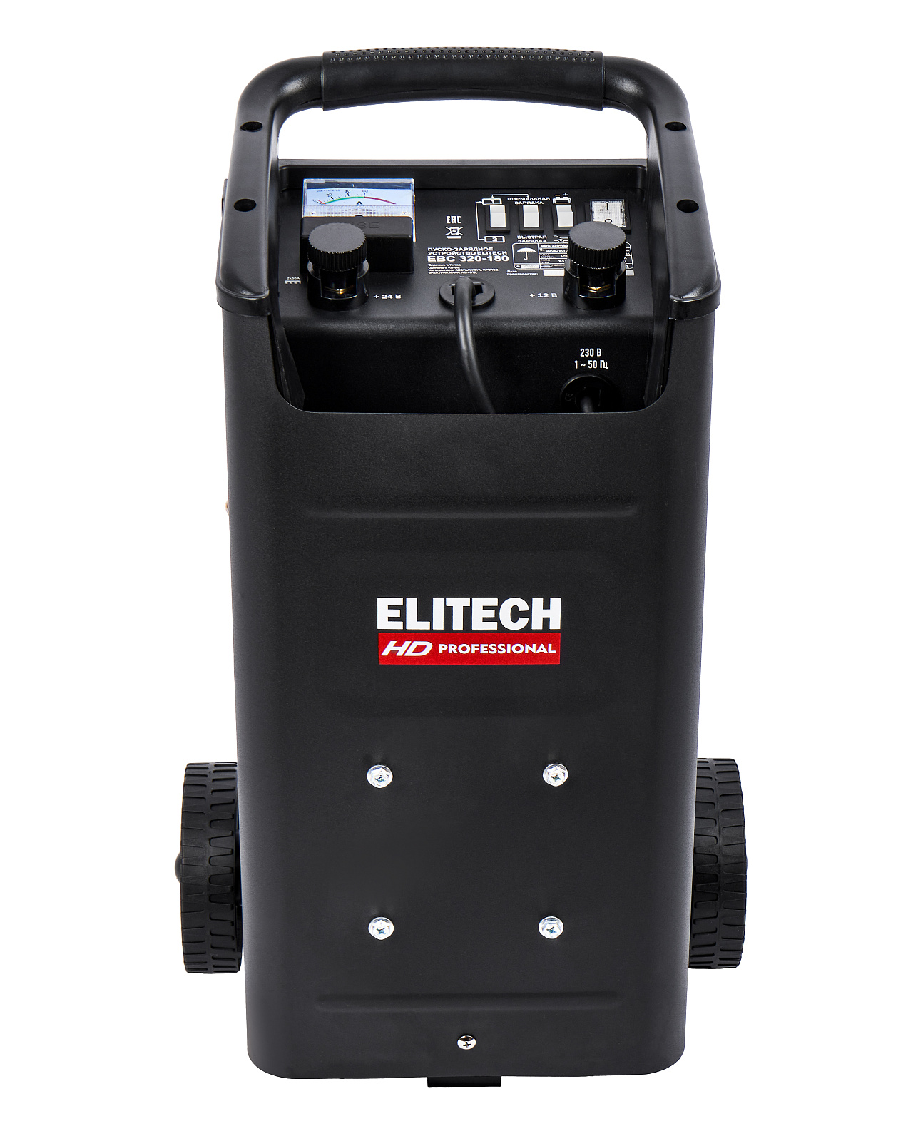 ELITECH HD PROFESSIONAL Пуско-зарядное устройство ELITECH HD EBC 320/180. Предназначено для зарядки свинцово-кислотных аккумуляторных батарей током 16/30 А и запуска двигателя автомобиля током 180 А при сильно разряженной батарее. Пуско-зарядное устройство снабжено предохранителем выходного и входного тока и подключается к сети 230 В.