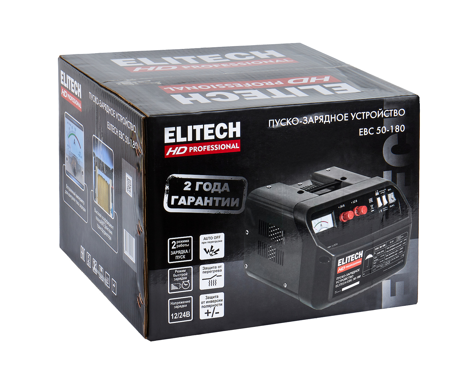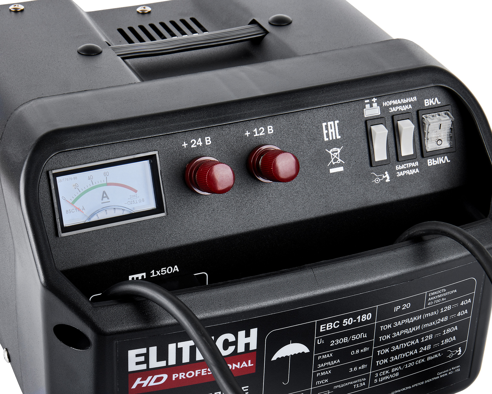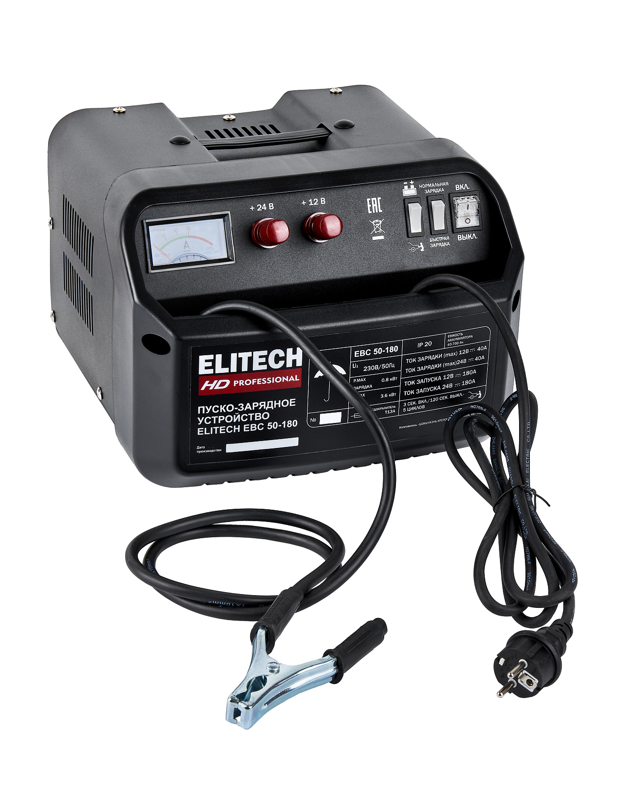 ELITECH HD PROFESSIONAL Пуско-зарядное устройство ELITECH HD EBC 50/180. Предназначено для зарядки свинцово-кислотных аккумуляторных батарей током 25/40 А и запуска двигателя автомобиля током 180 А при сильно разряженной батарее. Пуско-зарядное устройство снабжено предохранителем выходного и входного тока и подключается к сети 230 В.