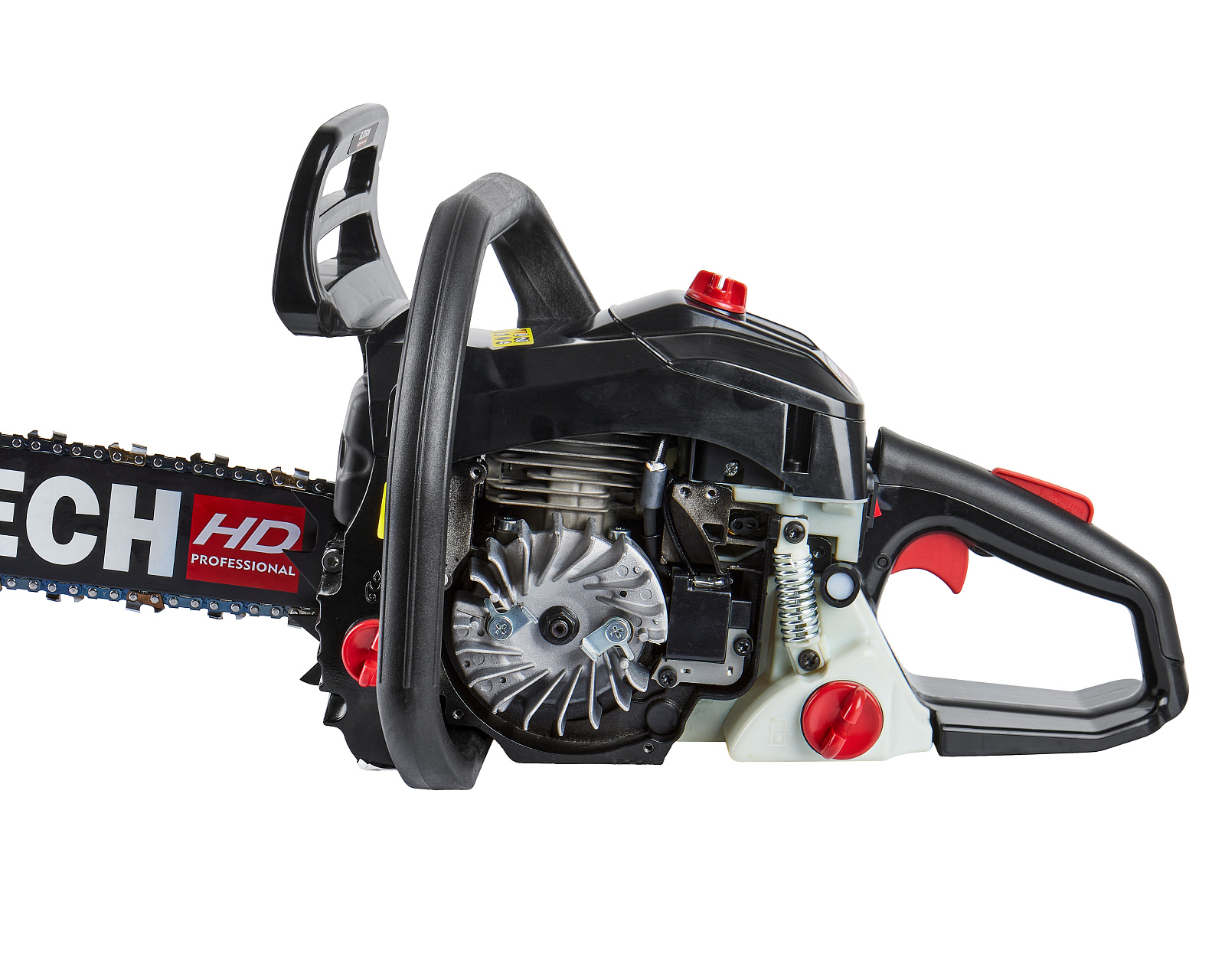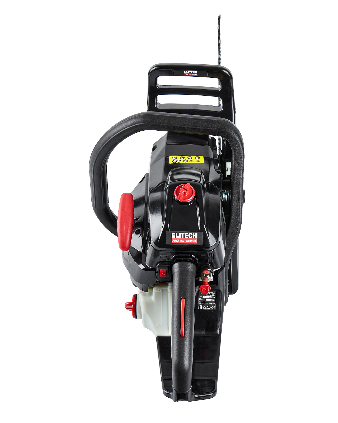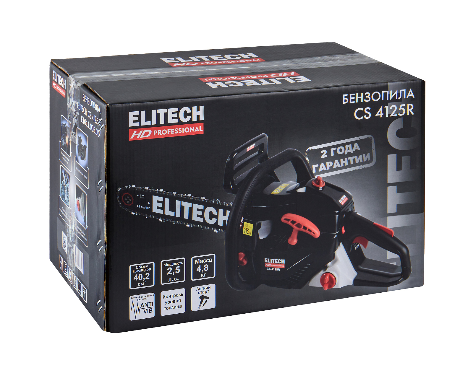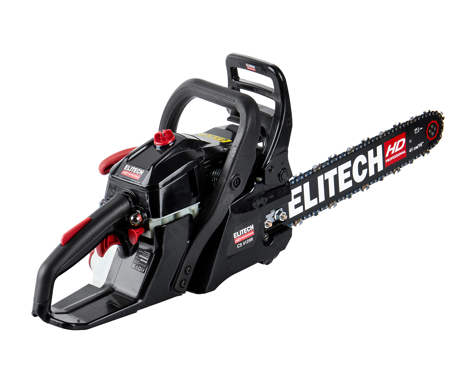 Цепная пила бензиновая ELITECH HD CS 4125R (E1611.005.00). Предназначена пиления древесины вне помещений, на открытом воздухе. Выполняемые операции: валка деревьев, обрезка сучьев, раскряжевка ствола на сортименты, пиление дров. Цепная пила оснащена двухтактным двигателем внутреннего сгорания, работающим на смеси бензина и 2-тактного масла, приводящим в движение пильную цепь, двигающуюся по направляющей шине