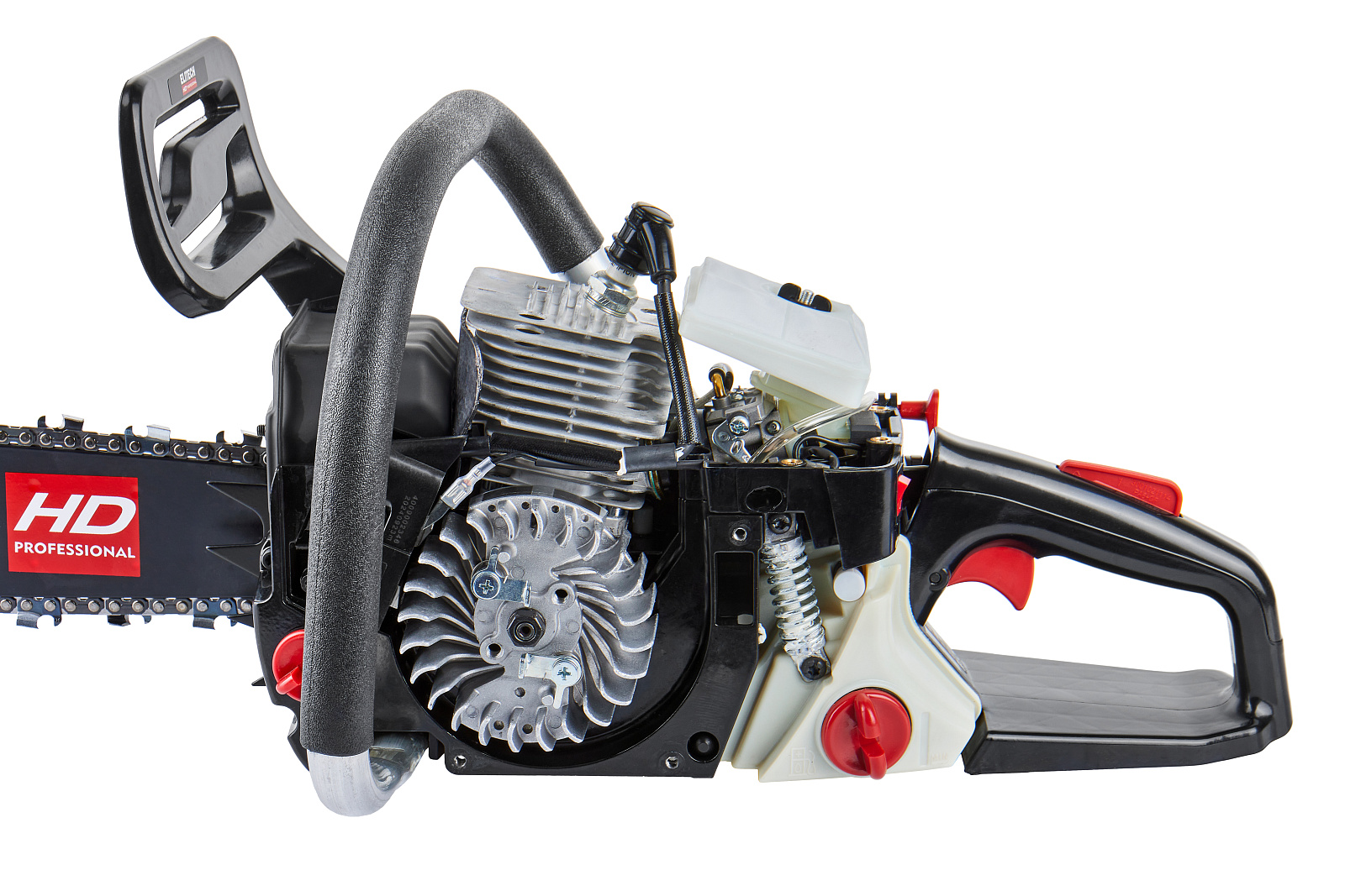 Цепная пила бензиновая ELITECH HD CS 5841F (E1611.007.00). Предназначена пиления древесины вне помещений, на открытом воздухе. Выполняемые операции: валка деревьев, обрезка сучьев, раскряжевка ствола на сортименты, пиление дров. Цепная пила оснащена двухтактным двигателем внутреннего сгорания, работающим на смеси бензина и 2-тактного масла, приводящим в движение пильную цепь, двигающуюся по направляющей шине