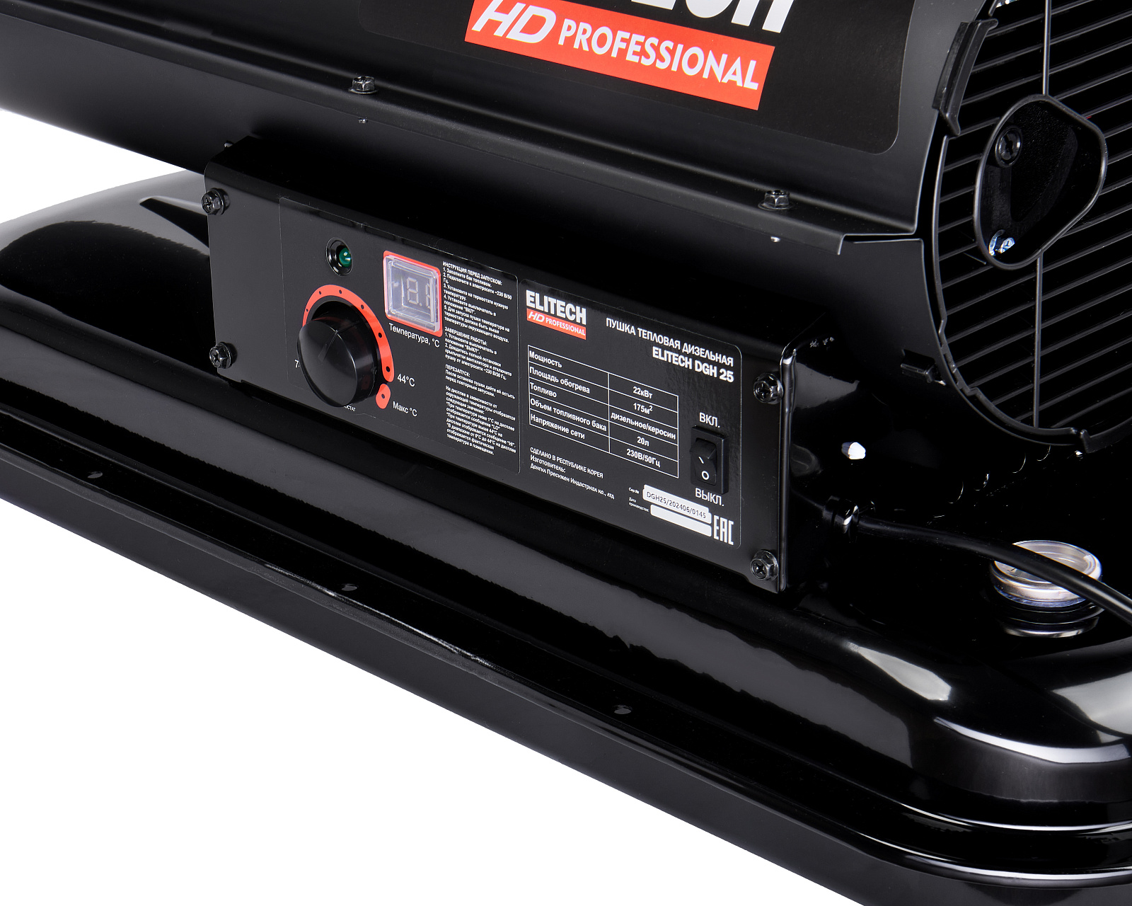 ELITECH HD PROFESSIONAL Дизельная тепловая пушка прямого нагрева ELITECH HD DGH 25. Предназначена для работы на открытых/полузакрытых площадках и временного обогрева/просушки хорошо проветриваемых помещений или с работающей приточно-вытяжной вентиляцией. Запрещено использовать воздухонагреватель в жилых помещениях и в помещениях с не функционирующей вентиляционной системой.