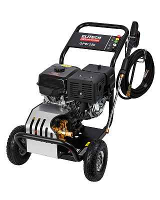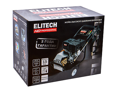 Мойка высокого давления с бензиновым двигателем мощностью 7 л.с., с четырьмя распылительными насадками, предназначена для мойки автомобилей и любой другой техники, а также террас, тротуарной и фасадной плитки, фасадов зданий и для прочистки дождевых сливов. Мойка должна работать только с чистой водой без механических примесей. Для бесконтактной мойки с применением пеногенератора используется специальное средство, предназначенное для этих целей. Мойка Elitech является самовсасывающей и может забирать воду, как из водопровода, так и из емкости с водой.Мойка может эксплуатироваться в следующих условиях: - рабочая температура окружающего воздуха – от +1°С до +40°С; - влажность – до 80% при температуре +25°С; - высота над уровнем моря до 1000 м