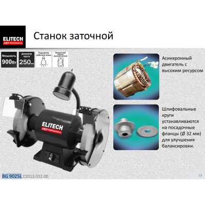 ELITECH HD PROFESSIONAL Станок заточный ELITECH HD BG 9025L (E2013.012.00).Предназначен для обточки и шлифовки различных предметов, а также заточки дереворежущего, металлорежущего и другого инструмента.