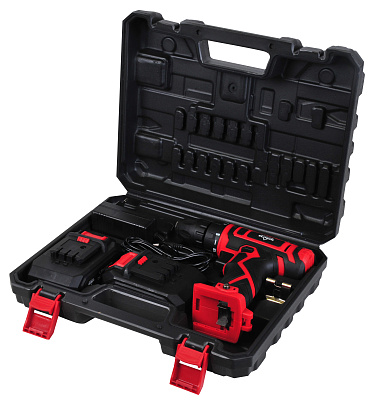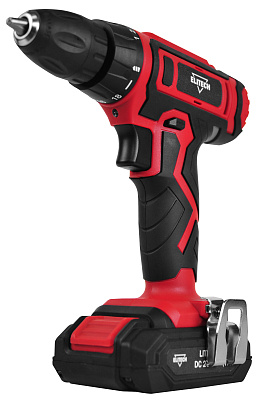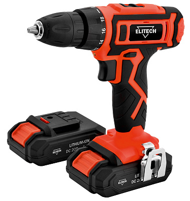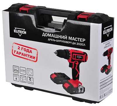 Аккумуляторная дрель-шуруповерт ELITECH ДА 202СЛ (E2201.017.01) предназначена для установки крепежа, сверления отверстий в черных и цветных металлах, дереве и производных материалов на его основе (фанера, ДСП, OSB, МДФ и подобные), а также различных видов пластика. Примером использования является проведение отделочных и строительных работ, установка легкого оборудования, сборка мебели, монтаж кухонь, использование в мастерской и в домашнем хозяйстве. Дрель имеет две скорости (0-350 и 0-1350 об/мин), реверс, муфту ограничения крутящего момента с 18-ю положениями и возможностью отключения (для режима сверления). Патрон бесключевой, двухмуфтовый, с диапазоном зажима от 0,8 до 10 мм. Эргономичная рукоятка имеет накладки для предотвращения проскальзывания в руке. Имеется светодиодная подсветка, скоба подвеса на ремень, индикатор уровня заряда аккумулятора (на корпусе дрели), встроенные магниты (2 шт.) для хранения запасных (сменных) бит. Шестерни в редукторе выполнены из стали. Для питания дрели используется Li-Ion аккумулятор, напряжением 20 вольт и емкостью 1,7 Ач (в комплекте 2 шт.). Время заряда аккумулятора штатным зарядным устройством составляет 60 минут.
