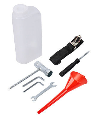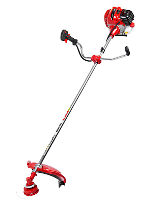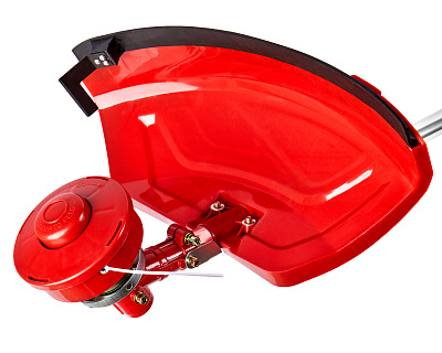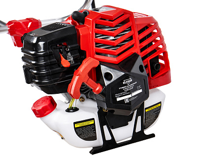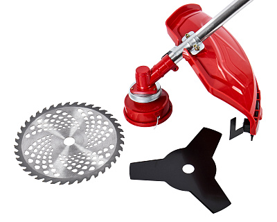 Бензиновый триммер для кошения травы леской (кордом 440 мм) и ножом (255 мм) с двухтактным двигателем мощностью 2,4 л.с. (1,77 кВт) выполнен с неразборной штангой.
