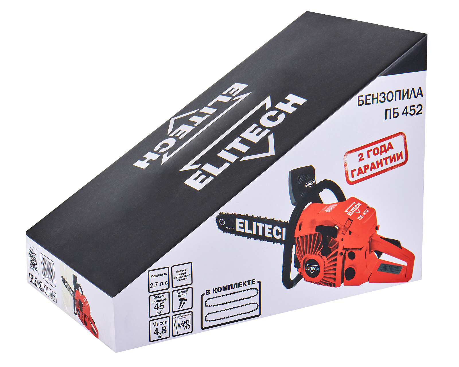 Бензиновая цепная пила Elitech ПБ 452 (E1611.013.00) мощностью 2,7 л.с. и с шиной длиной 45 см, предназначена для валки деревьев, обрезки веток и сучьев, раскряжевки и заготовки дров. Может применяться для плотницких работ, расчистки местности от кустарников и молодой поросли деревьев, и других хозяйственных работ, связанных с пилением древесины.