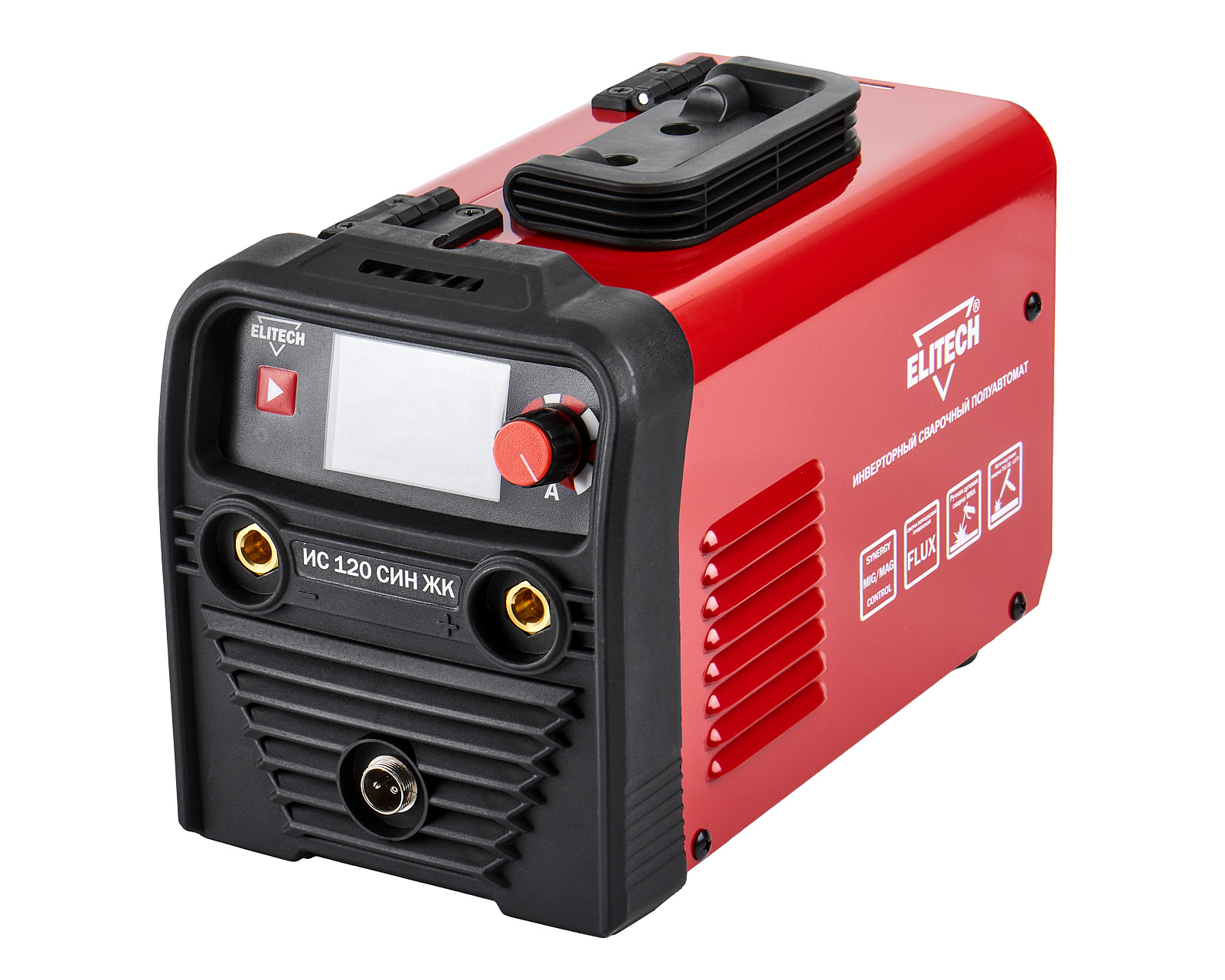 Сварочный полуавтомат ELITECH ИС 120 СИН ЖК. Предназначен для сварки стали (углеродистой и нержавеющей) на постоянном токе методом полуавтоматической сварки с синергетическим управлением MIG FLUX – проволокой с порошковым флюсовым покрытием без газа, а также методом электродуговой сварки ММА штучным покрытым электродом и LIFT TIG – аргонодуговой сваркой неплавящимся вольфрамовым электродом и присадочными прутками в среде инертного защитного газа – аргона.