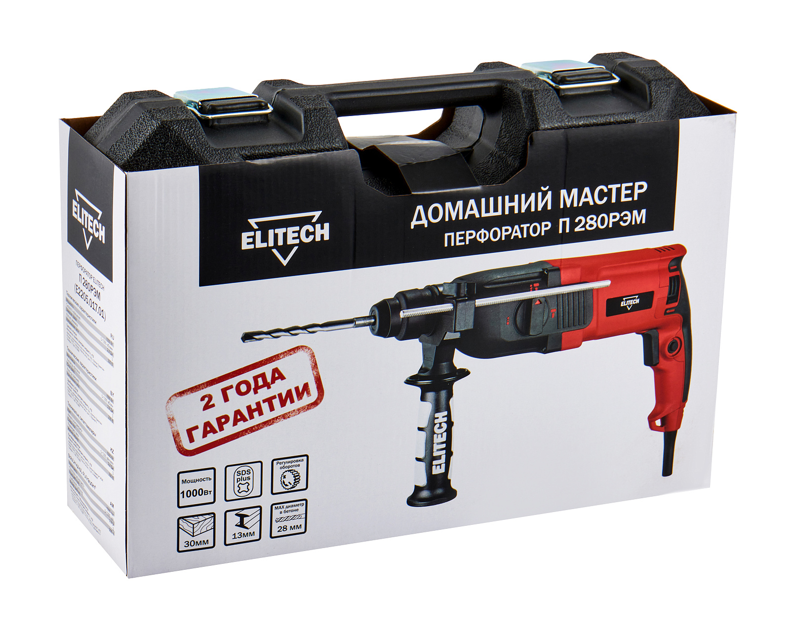 Перфоратор ELITECH ДМ П 280РЭМ (E2205.017.01). Предназначен для бурения отверстий, штробления пазов, разрушения твердых материалов, таких как кирпич, бетон, природный и искусственный камень и т.п. В качестве рабочих насадок в перфораторе могут использоваться бур, зубило, коронка. Патрон SDS-Plus.