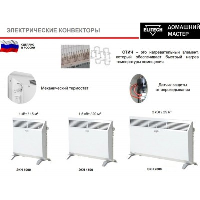 Электрический конвектор ELITECH ДМ ЭКН 1000. Предназначен для обогрева любых помещений площадью до 15 кв.м и автоматического поддержания в них заданной температуры.