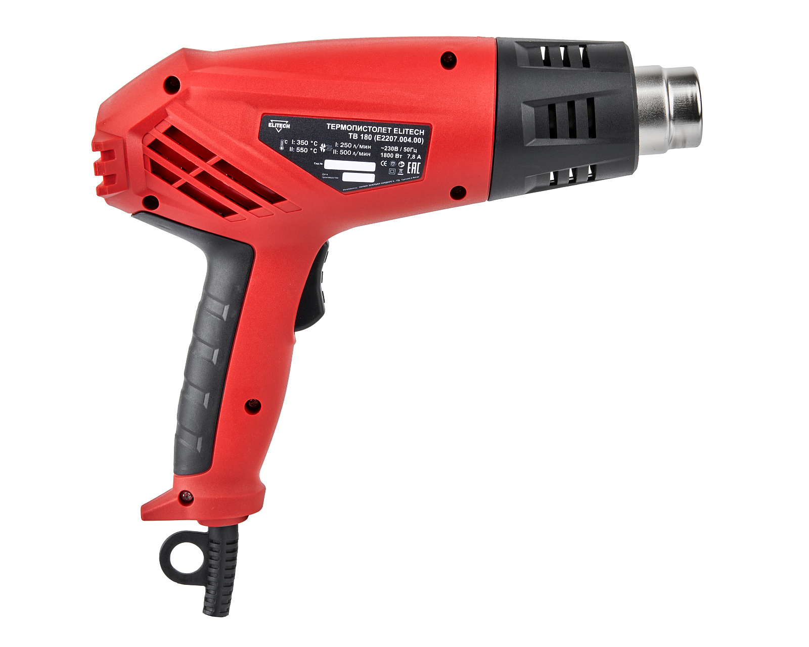 Фен технический (строительные) ELITECH ДМ ТВ 180 (E2207.004.00). Предназначен для: снятия лакокрасочных покрытий с любых поверхностей; пайки и формовки пластика; деформации плексигласа, ПВХ и полистирольных плит; защиты проводов и кабелей термопластичной оболочкой; пайки мягким припоем и лужение; сварки или резки линолеума, рубероида и т. д.; ускорения процессов склеивания; размораживания; сушки и продувания поверхностей; заделки щелей с помощью пластиковой сварочной ленты.