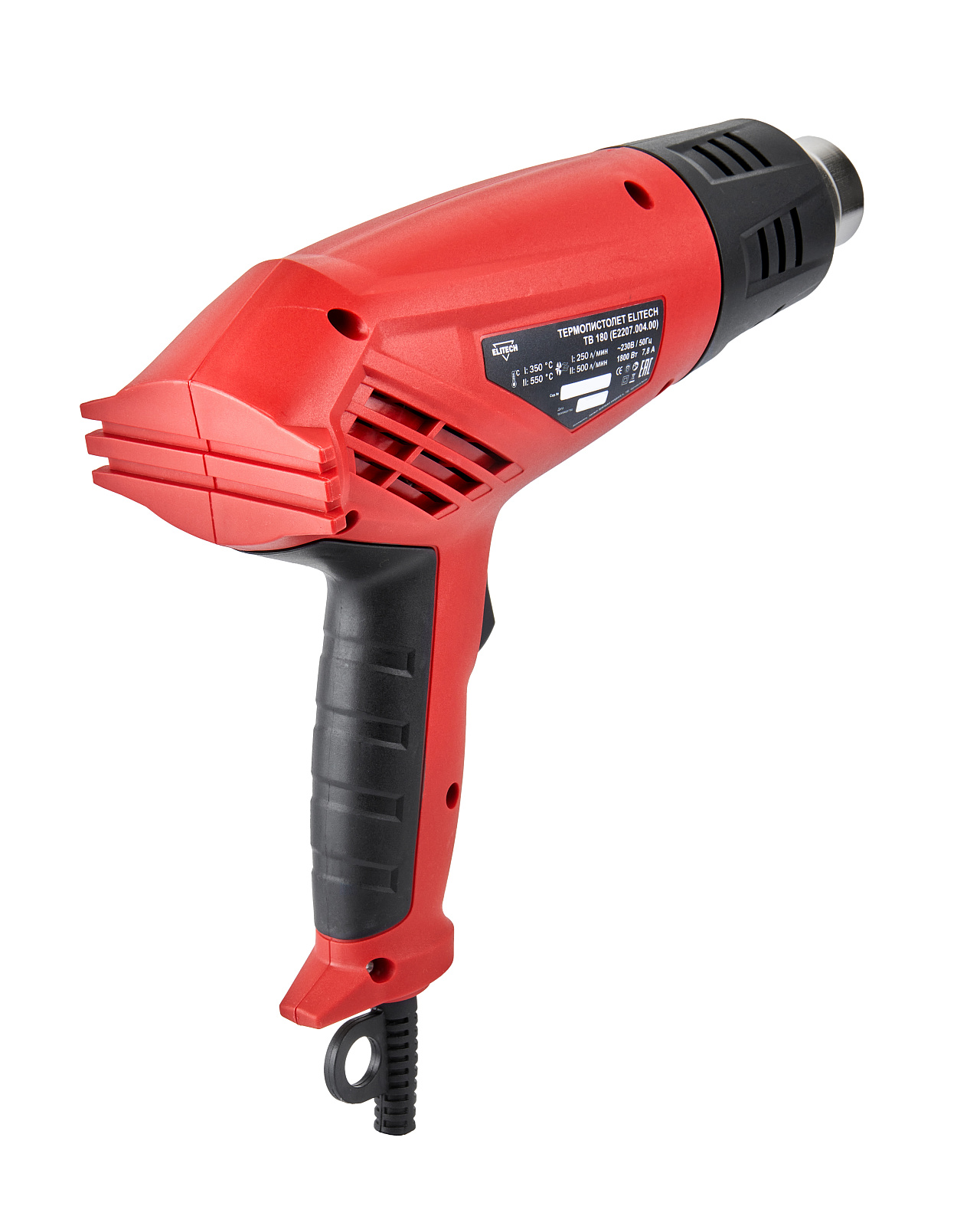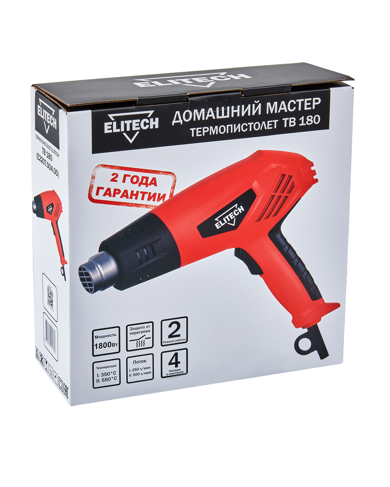 Термопистолет (технический фен) ELITECH ТВ 180 используется при следующих видах работ : снятие лакокрасочных покрытий с деревянных поверхностей, пайка, сварка и формовка пластика, осаживание термоусадочных материалов, ускорение процессов склеивания, пайка мягким припоем и лужение, сушка и размораживание, сварка и резка листовых и рулонных материалов (линолеума и подобных). Инструмент имеет два режима работы : температура 350 градусов при расходе воздуха 250 л/мин и температура 550 градусов при расходе 500 л/мин. Есть защита от перегрева и принудительное охлаждение при выключение. Длина сетевого кабеля 2 метра. Комплектация : понижающее сопло, плоское сопло, стеклозащитное сопло, рефлекторное сопло, паспорт. Поставляется в картонной коробке.