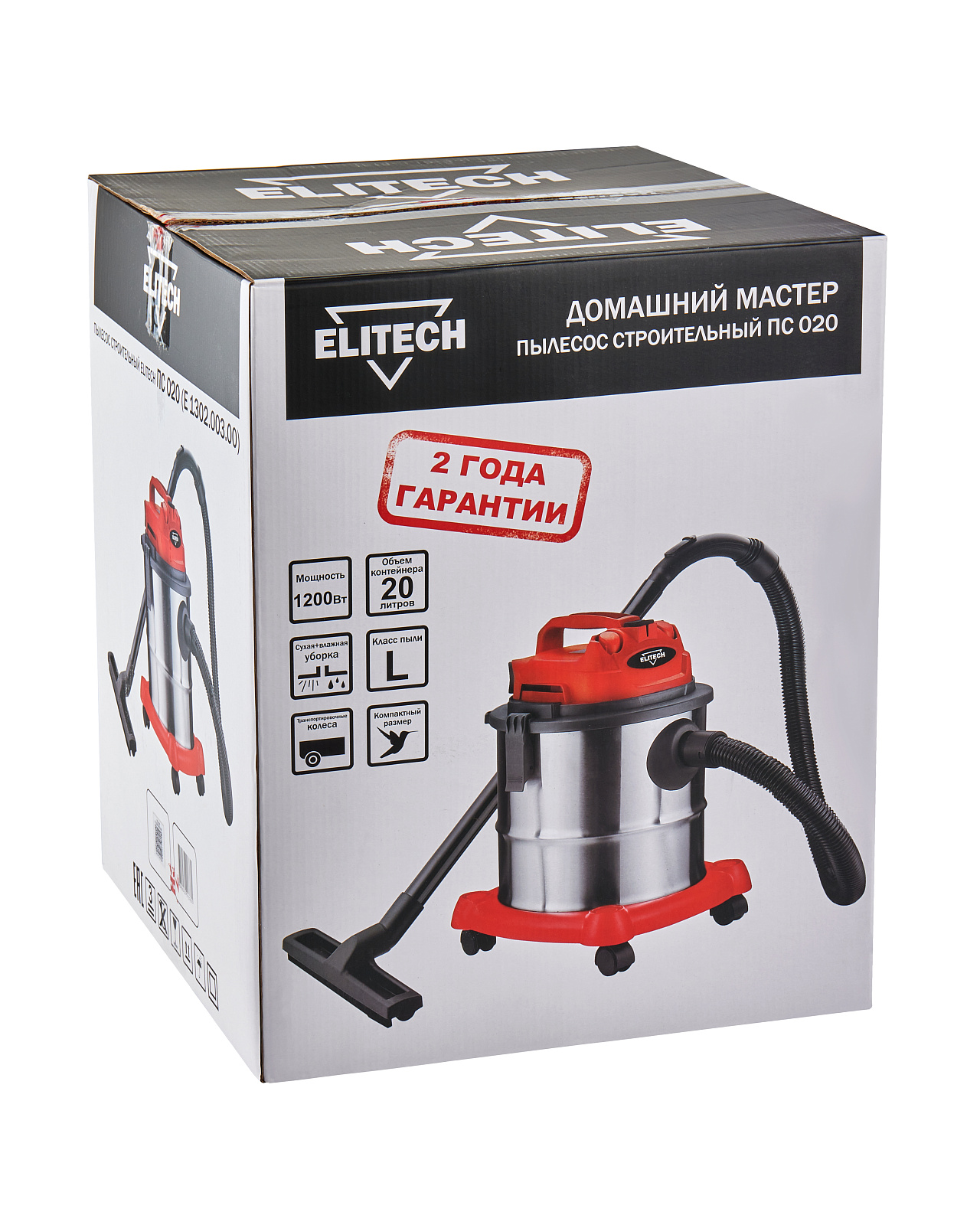 Пылесос строительный ELITECH ДМ ПС 020 (E1302.003.00). Предназначен для сбора бытовой, древесной и бетонной пыли, стружки, опилок при строгании, фрезеровании, шлифовки и распиловке древесины, работ по бетону с возможностью сбора жидкости. Пылесос должен эксплуатироваться в районах с умеренным климатом, в температурном диапазоне от +1°С до +35°С и относительной влажности воздуха не более 80%. Пылесос не предназначен для удаления отходов металлообработки, химической переработки и смежных отраслей.
