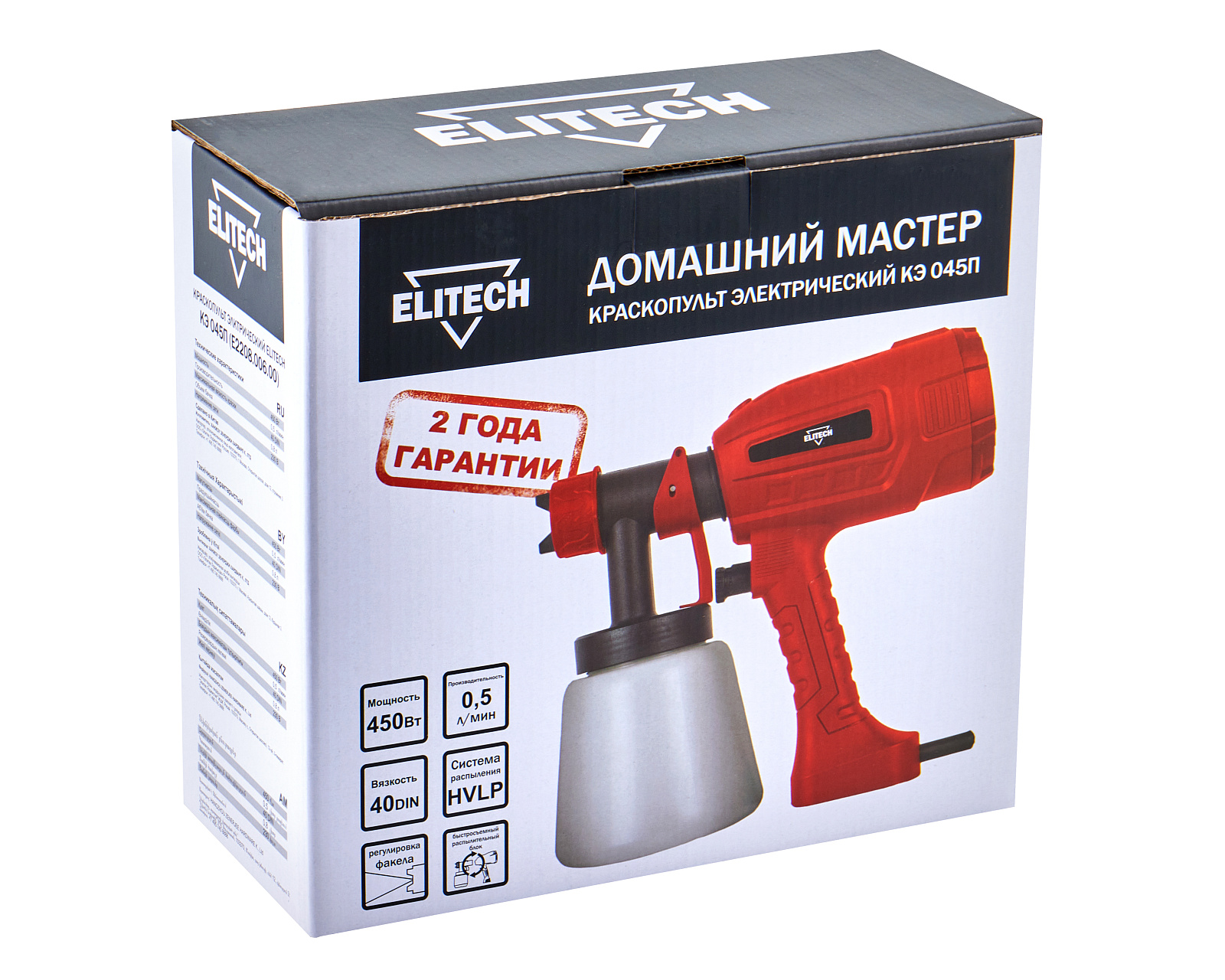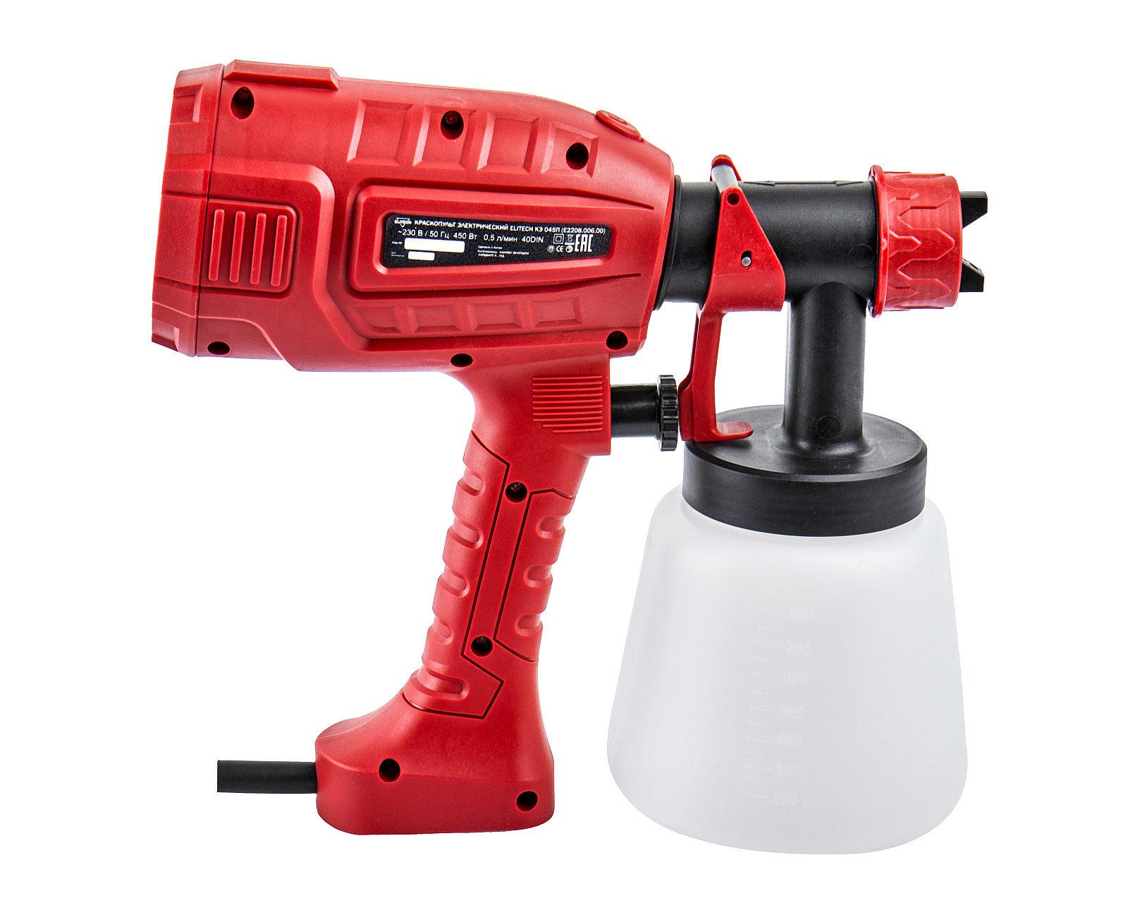 Краскопульт электрический ELITECH ДМ КЭ 045П (E2208.006.00). Предназначен для распыления эмалевых и водоэмульсионных красок, грунтовок, прозрачных лаков, морилок, средств защиты древесины, масел, дезинфицирующих средств на основе растворителей и воды. Краскопульт НЕ ПРЕДНАЗНАЧЕН для распыления легковоспламеняющихся жидкостей (температура вспышки до 21°С), жидкостей, содержащих абразивные вещества, щелочи, кислоты и волокнистые включения, масляных красок. Краскопульт относится к бытовому классу и не предназначен для использования в коммерческих целях. Краскопульт предназначен для эксплуатации в районах с умеренным климатом, в температурном диапазоне от +1°С до +40°С и относительной влажности воздуха не более 80%.